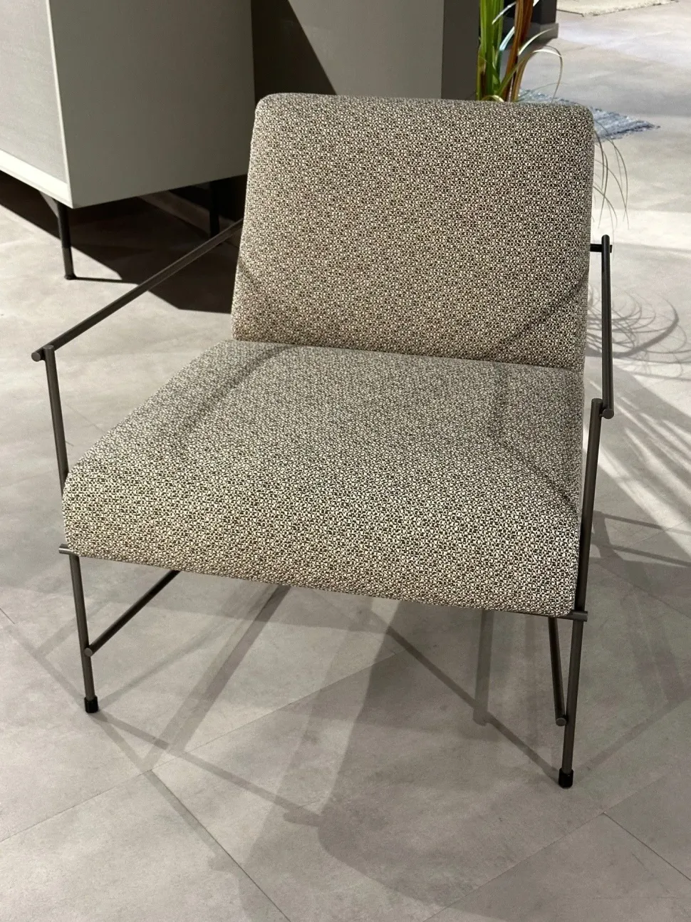 POLTRONA DAL DESIGN UNICO CON STRUTTURA IN TONDINO DI METALLO VERNICIATA LIGHT BROWN, SEDUTA IN TECNOFORM RIVESTITA IN TESSUTO TRAMATO. MISURA CM.77 P88 H79