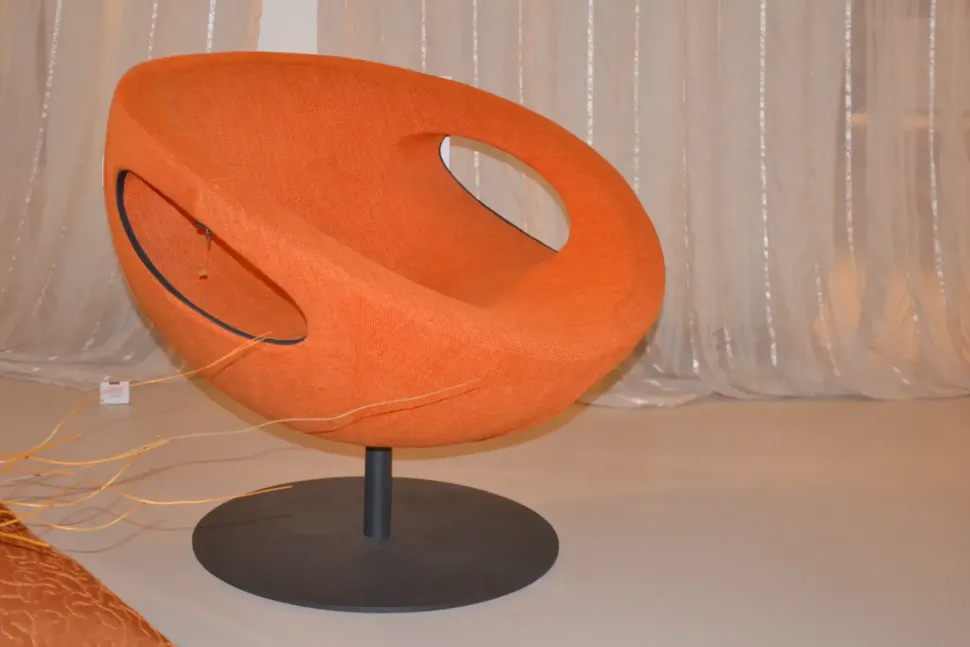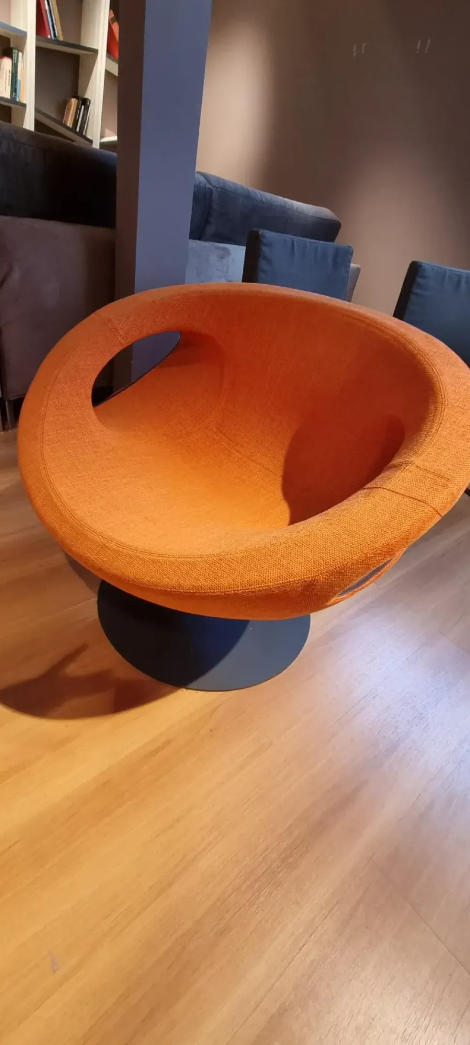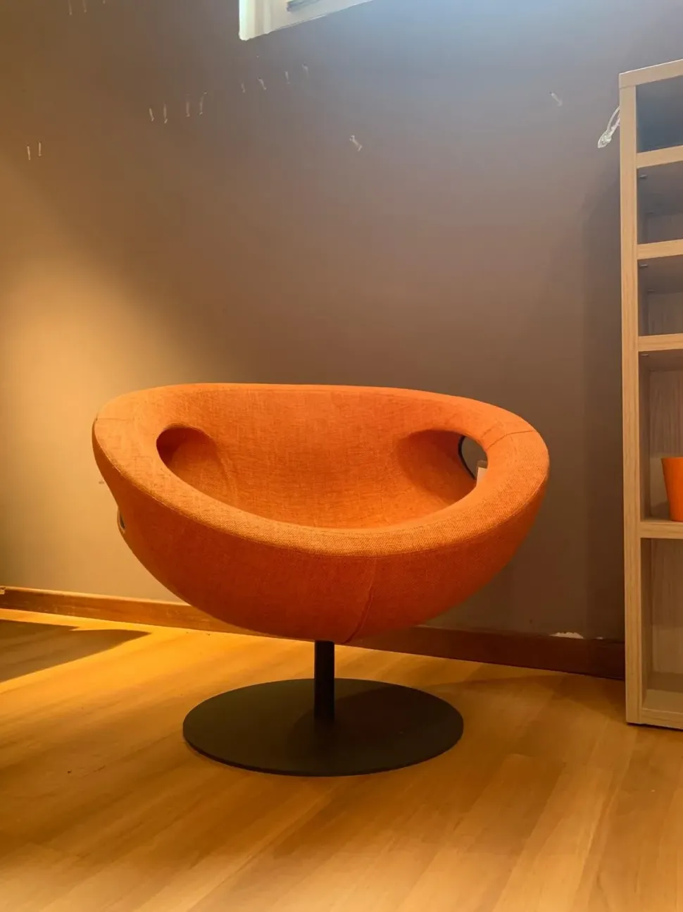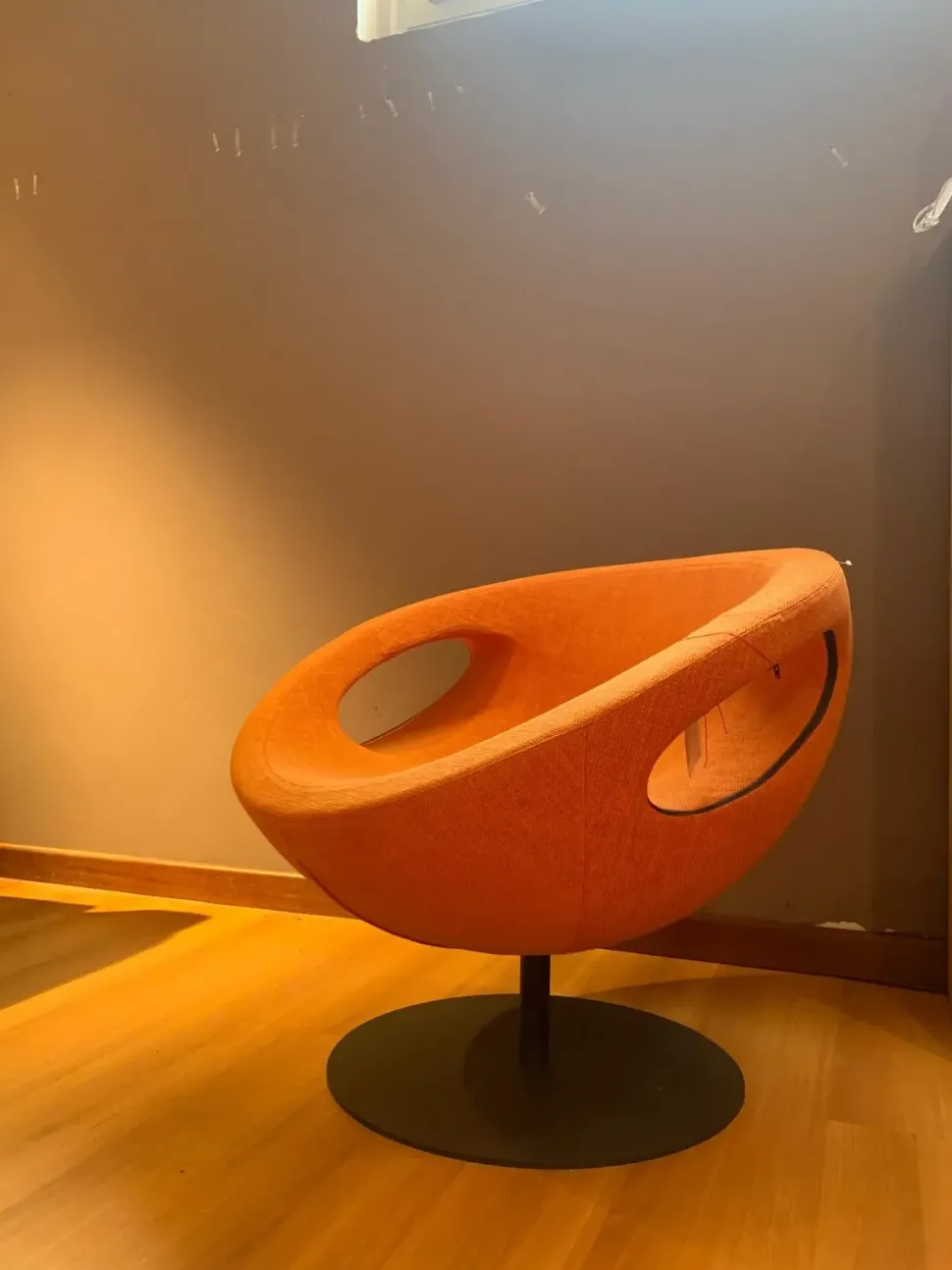 Poltrona in tessuto arancione girevole.