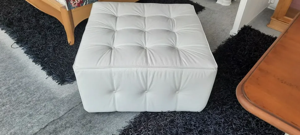 Pouf artigianale rivestito interamente in vera pelle bianca con capitonnè , misure 85x85x44h