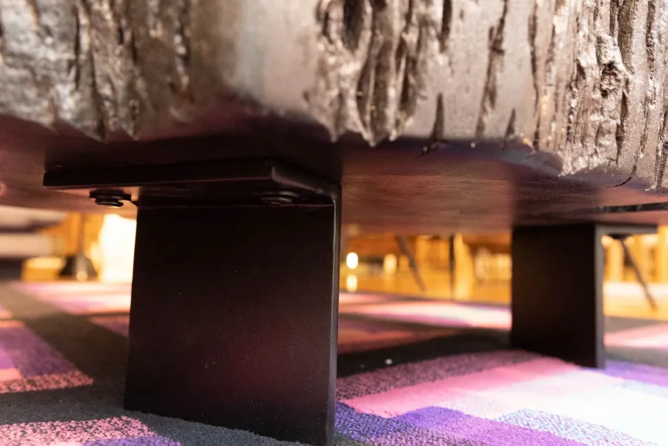 PIANO IN LEGNO DI ACACIA (SEZIONE ORIGINALE DI TRONCO). FINITURA A BASE DI VERNICE POLIURETANICA. GAMBE IN ACCIAIO VERNICIATO A POLVERE EPOSSIDICA. LE FORME E LE MISURE CREATE DAL LEGNO SONO SOLO INDICATIVE.