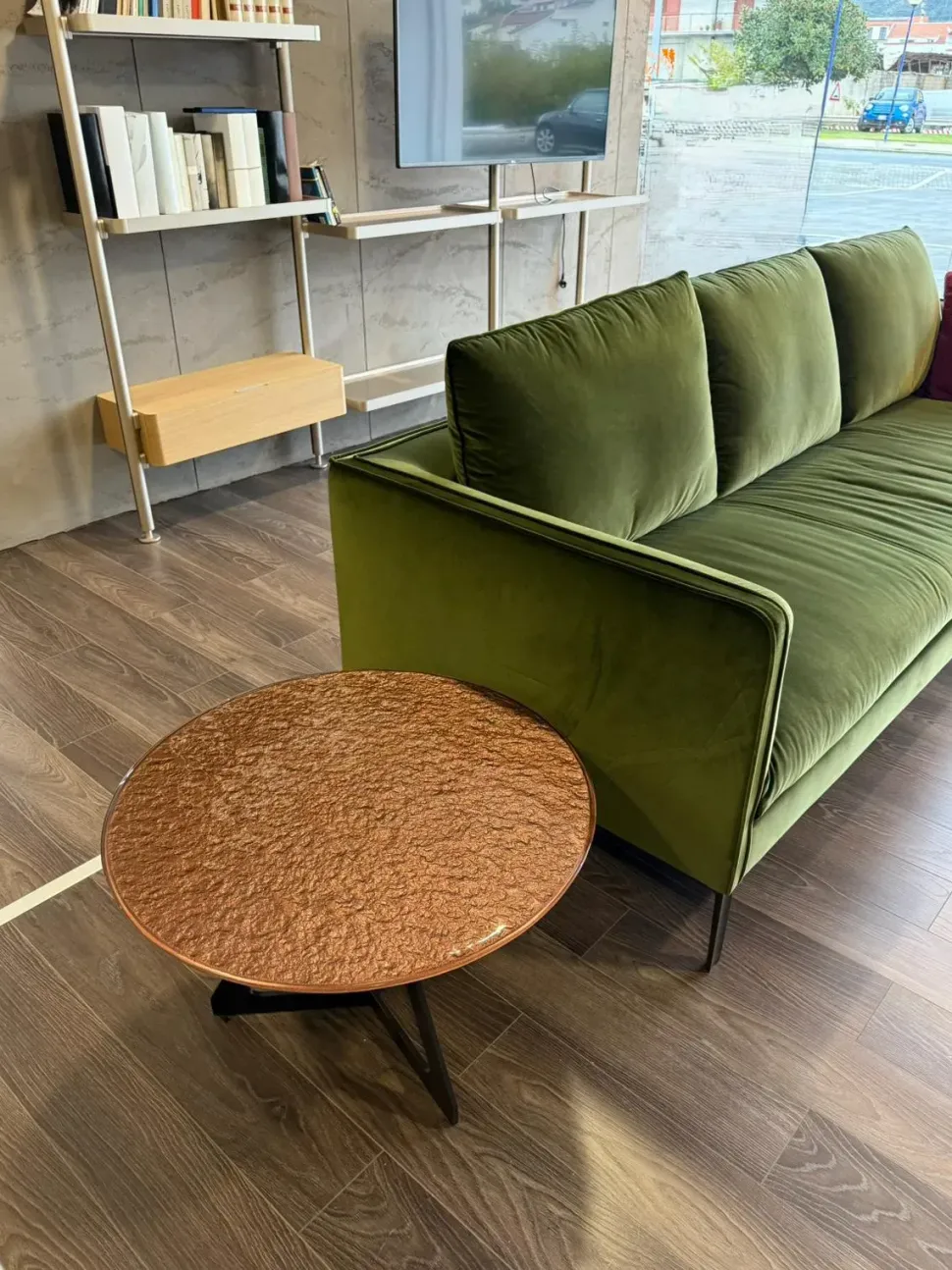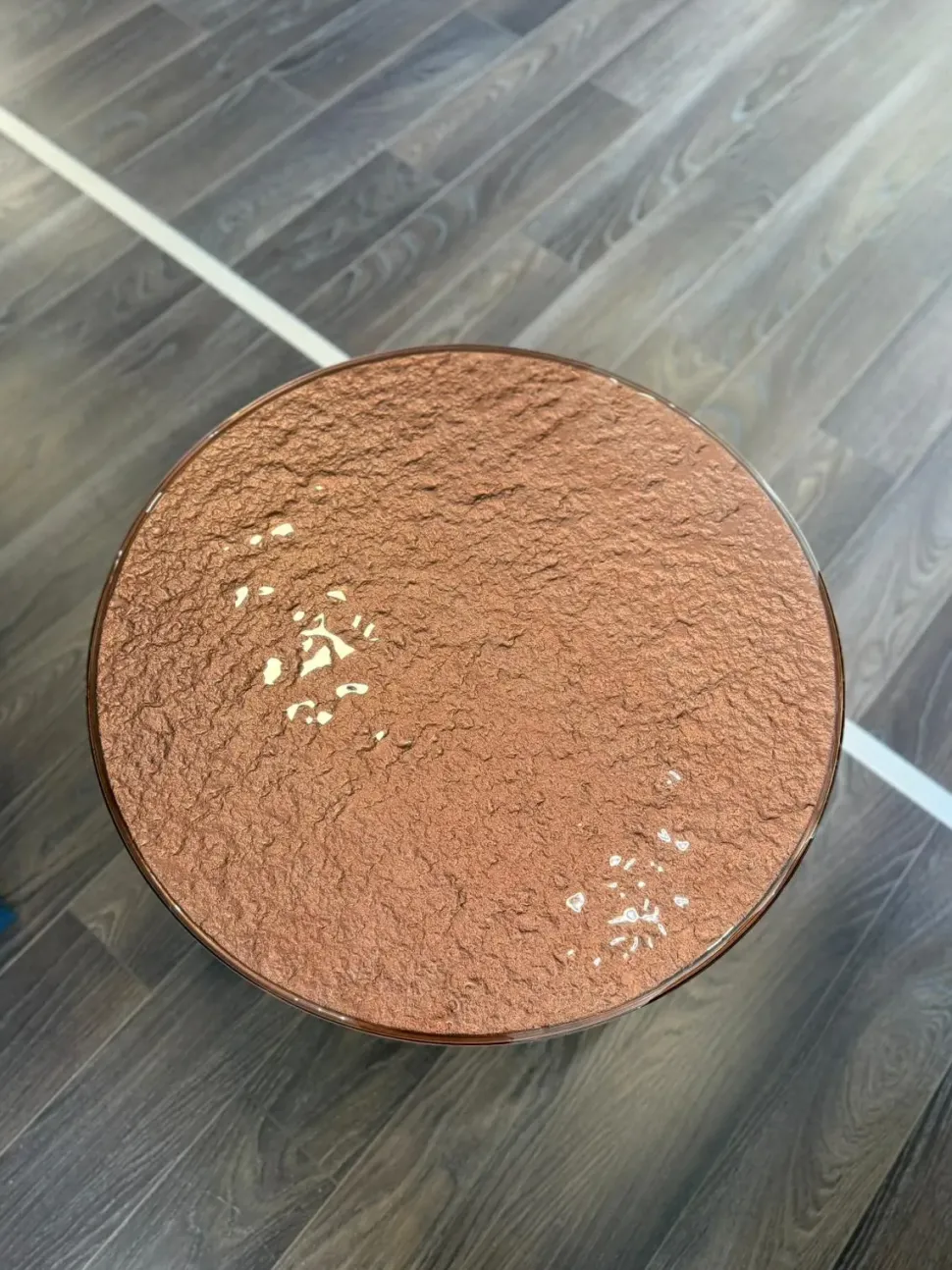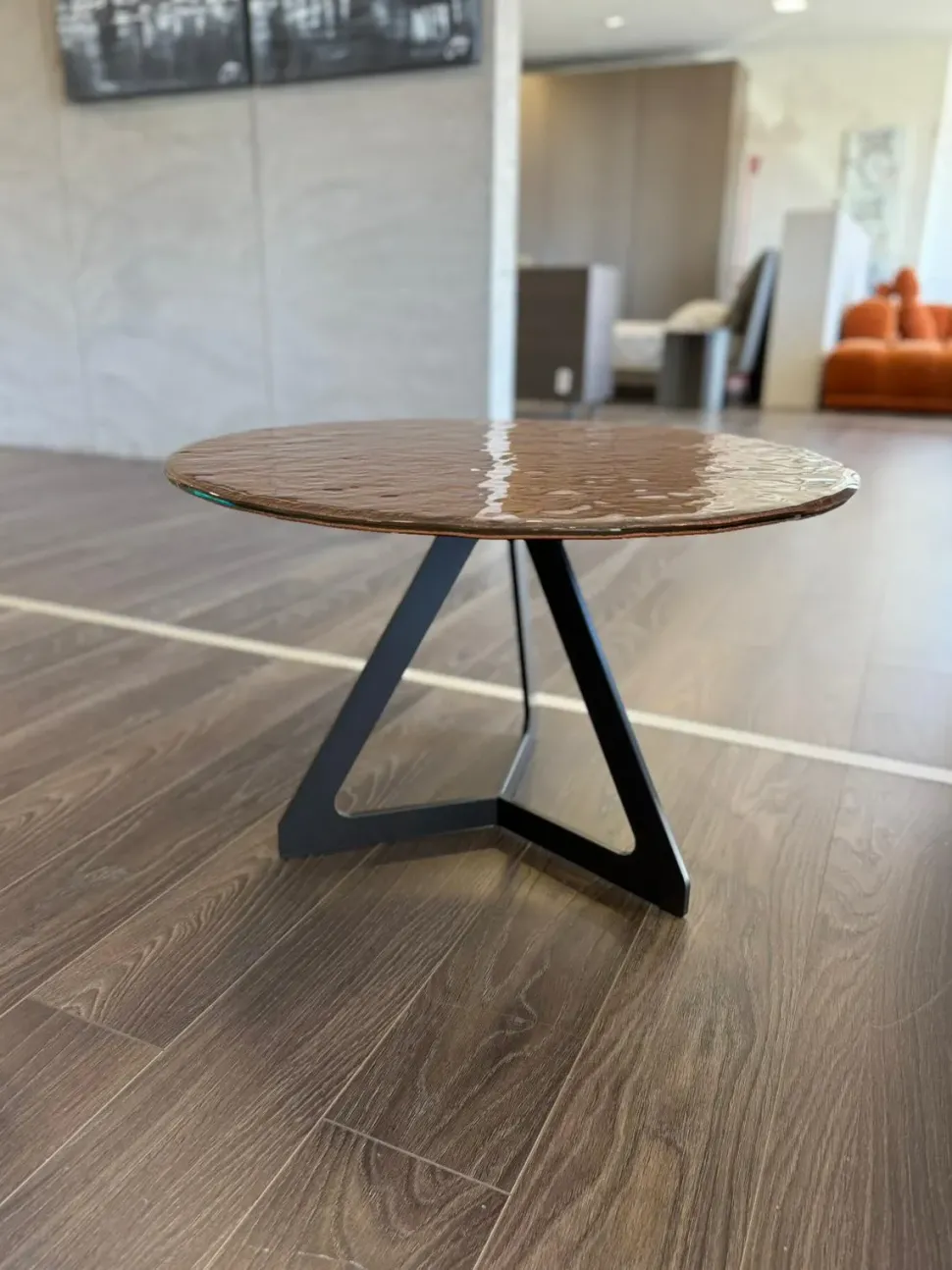 Piano in vetro fuso retroverniciato con tinte metallizzate marrone ramato e base in metallo verniciato opaco