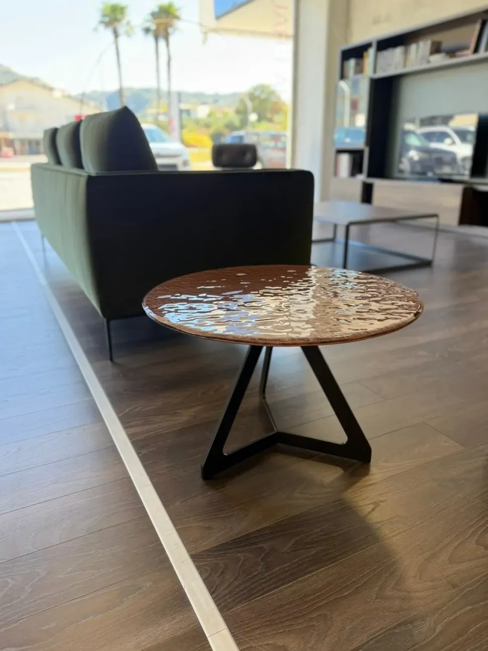 Il tavolino Lakes di Fiam, disegnato dallo Studio Klass, è un perfetto equilibrio tra eleganza scultorea e materiali di pregio. Il piano è realizzato in vetro fuso da 10 mm, retroverniciato con tinte metallizzate per creare effetti di trasparenza e riflessi.