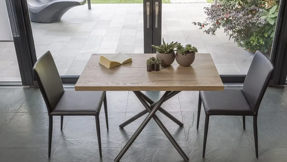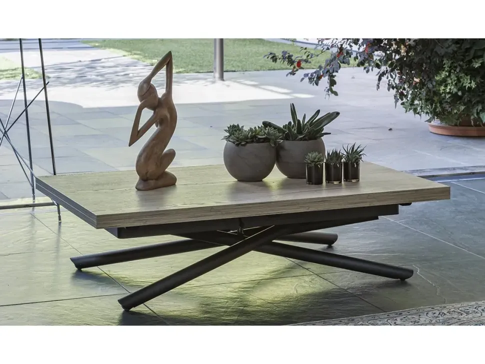 Tavolino trasformabile in tavolo da pranzo, base in metallo, meccanismo a gas.