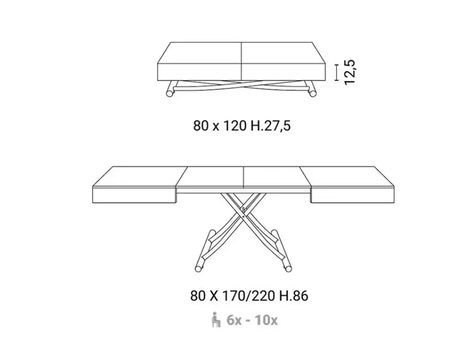 Il tavolino ha una lunghezza 120 cm, New Cover si convertire rapidamente in un tavolo da pranzo lungo 220 cm, pronto per ospitare fino a 10 persone. New Cover ha una base in metallo verniciato grafite opaco oppure bronzo mentre il pratico piano in eco legno, disponibile in diverse finiture. Il pianale è disponibile in tre effetti legno e tre nell’attuale finitura spatolata.