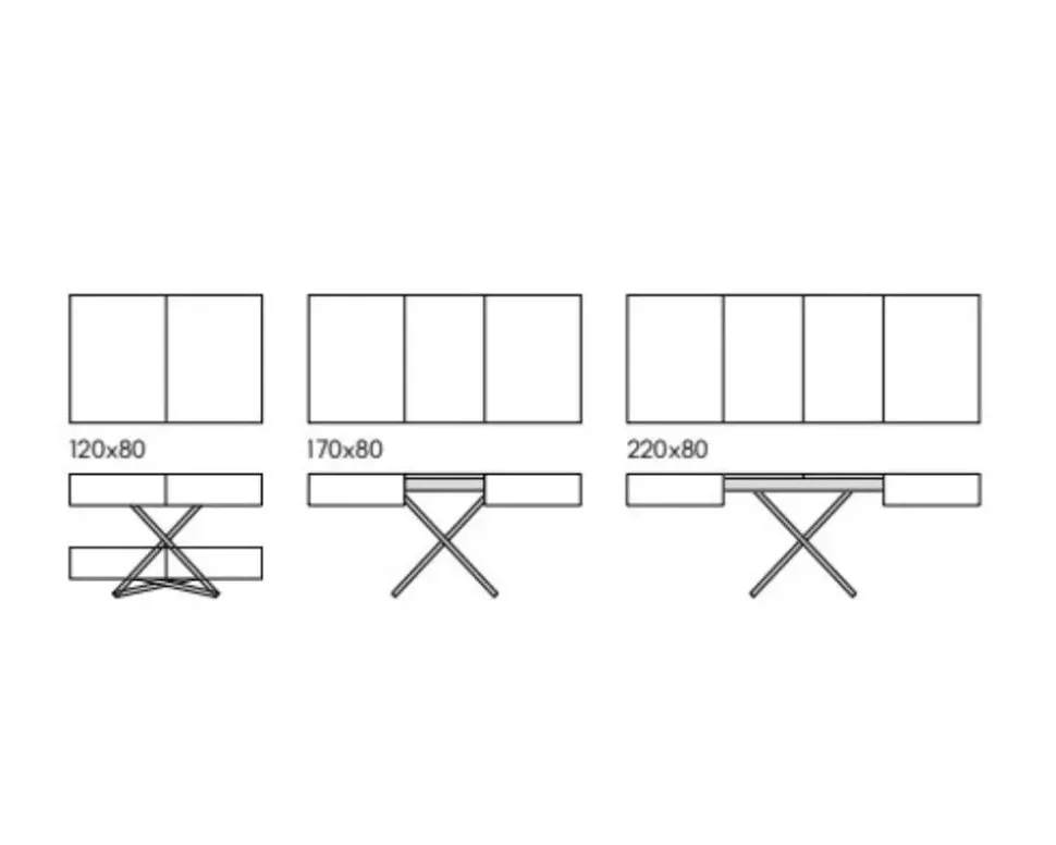 (aperto con una allunga 170 x 80; con due allunghe 220 x 80)