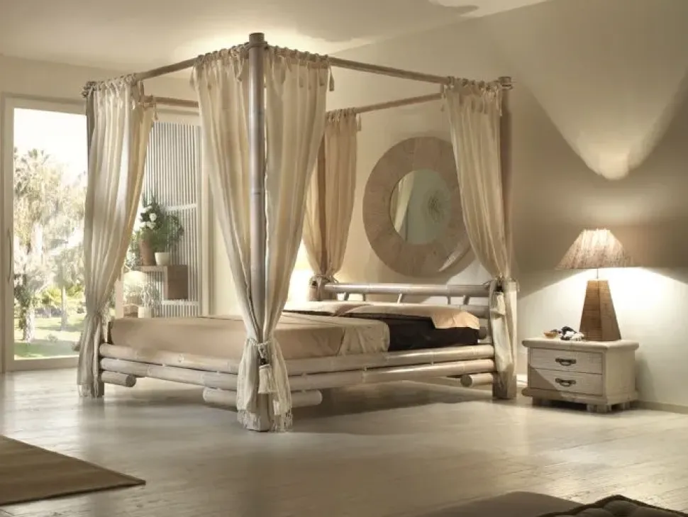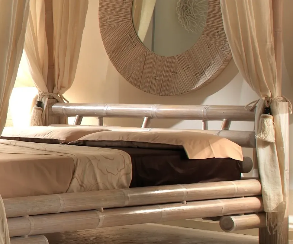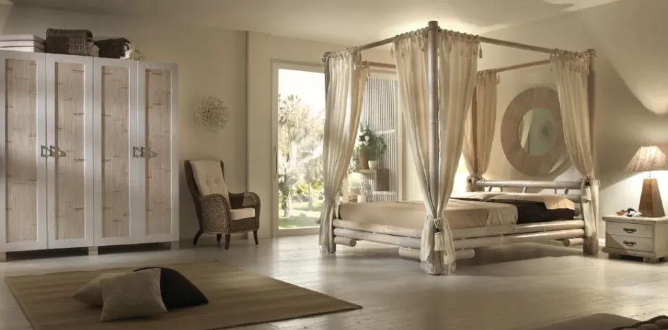 Il Letto Etnico a Baldacchino Tabanan, richiama con eleganza atmosfere esotiche e calde. Prodotto di alta qualità realizzato artigianalmente, la struttura è in legno massello di acacia, con preziosi particolari in bambù e crash bambù (bambù lavorato e pressato). Disponibile in due colori: decapato bianco (come in foto) oppure miele anticato. Misure letto: 183×242 h40/223 – misure rete a doghe in legno di bambù: 160×200
