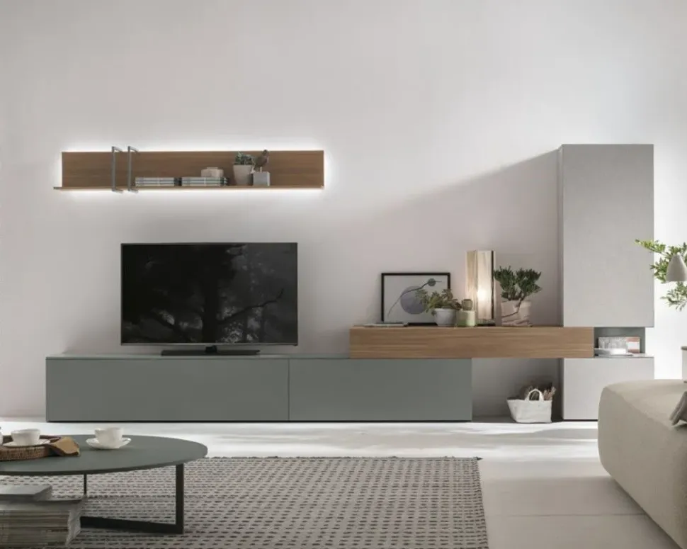 La parete attrezzata modello At114 nell’immagine saprà impreziosire il tuo living sottolineando le doti estetiche del locale: che tu voglia riporci libri, oggetti d’uso prettamente decorativo o la TV, questo mobile ti assicurerà tutta la qualità del brand Tomasella a prezzi imbattibili.