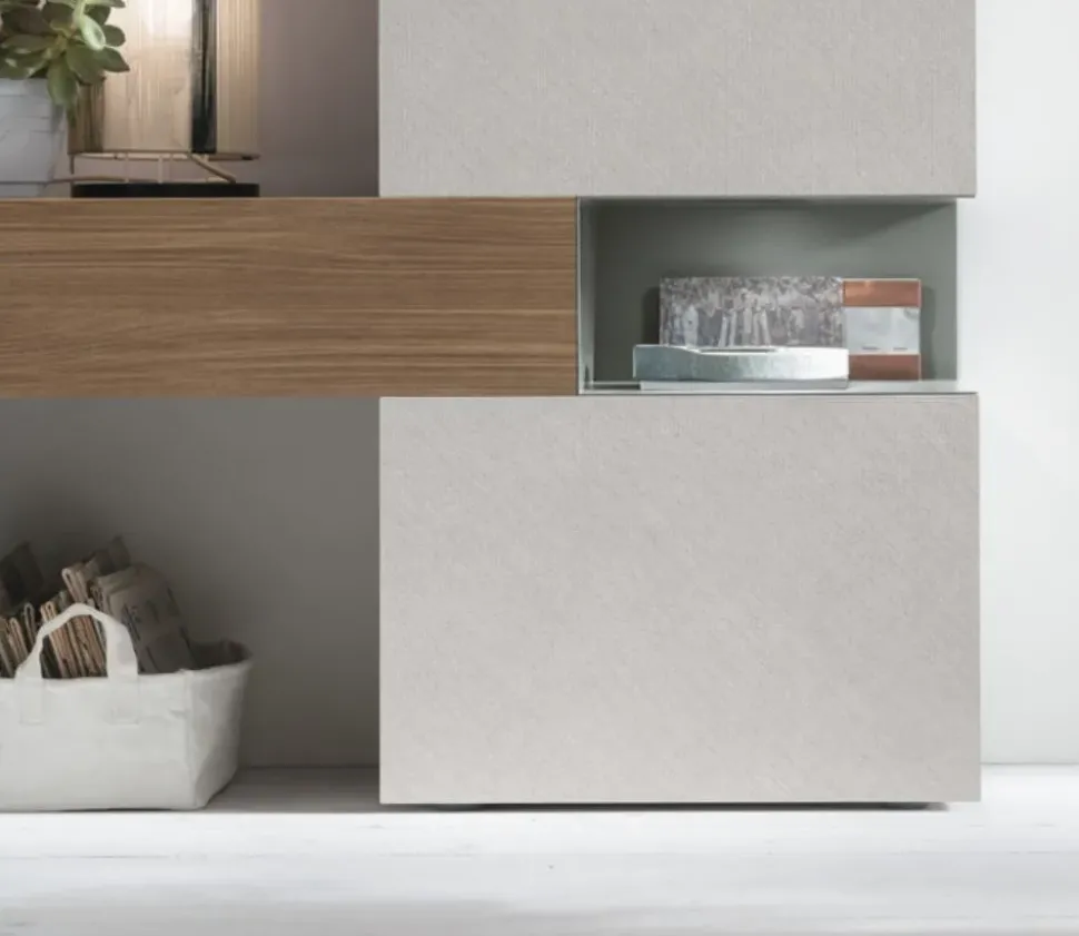 Finiture della composizione: Materico noce ambra, Materico canvas, Laccato opaco basalto n. 177, Metallo basalto n. 177.