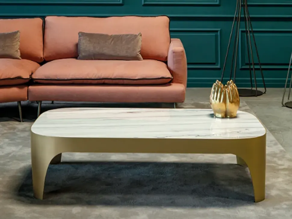 Tavolino in acciaio sagomato verniciato e top in gres porcellanato.