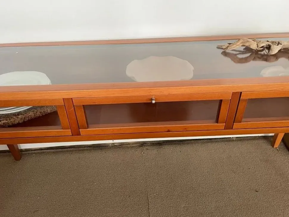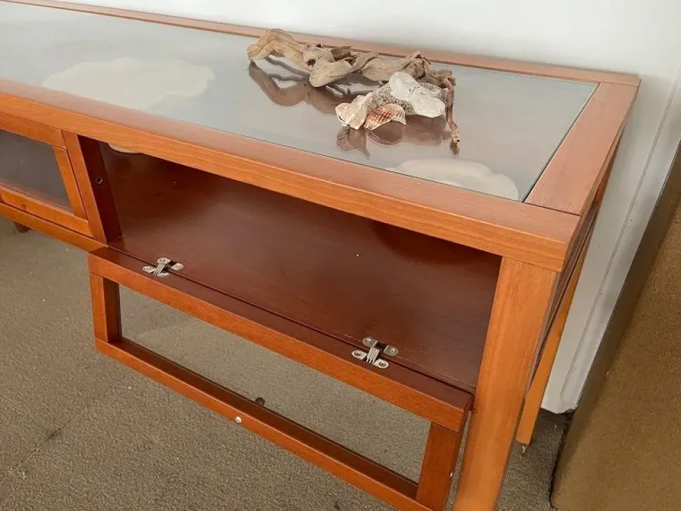 MOBILE IN CILIEGIO HALIFAX CON PIANO SUPERIORE IN VETRO TRASPARENTE E ANTE IN VETRO TRASPARENTE CON POMELLI IN ACCIAIO.