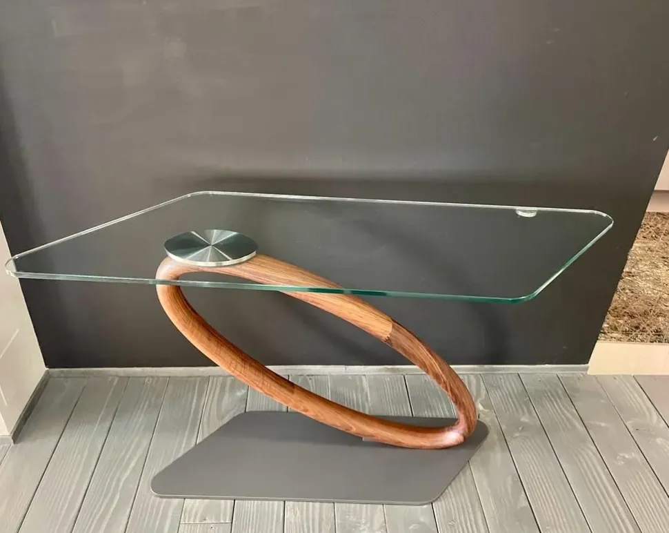 Consolle con base in acciaio vernicito goffrato graphite, gamba ovale in noce canaletto e piano in cristallo trasparente.