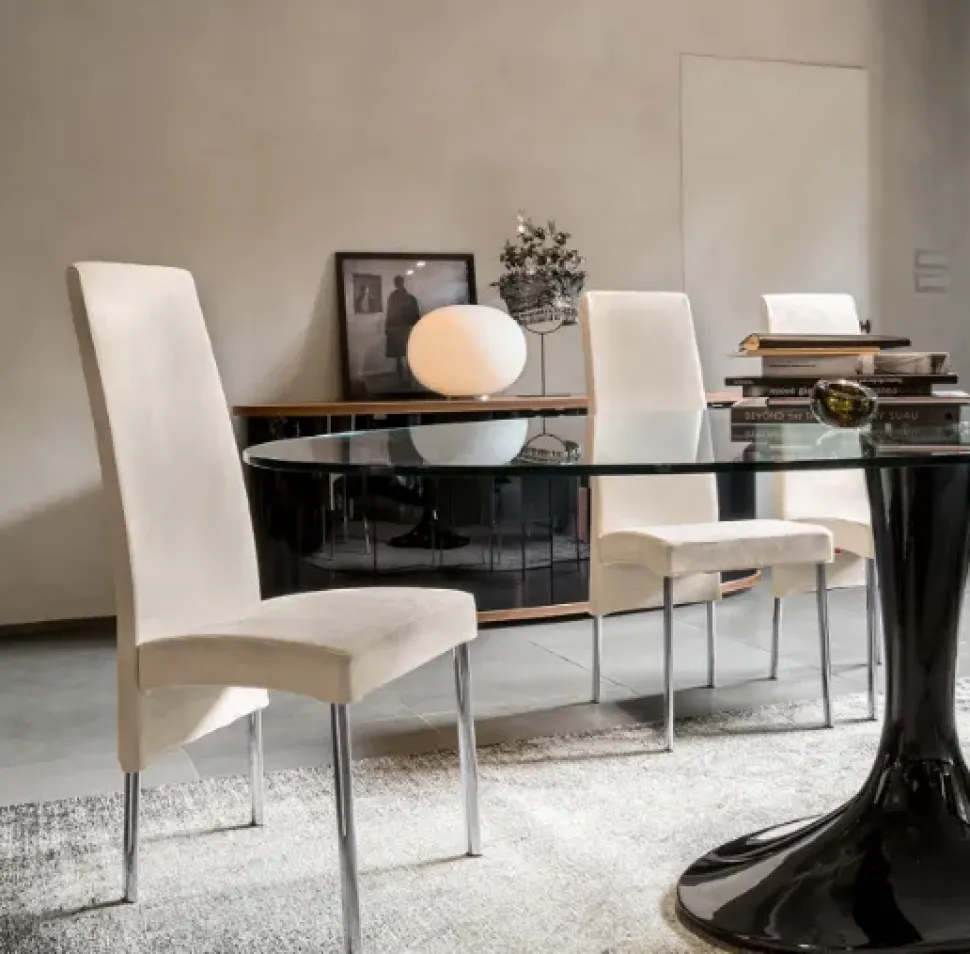 Sedia in poliuretano schiumato rivestita in ecopelle, pelle, tessuto o velluto con struttura in metallo cromato.