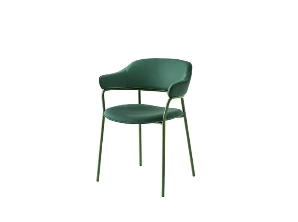 Sedia SIGNORINA a quattro gambe in tubo di metallo e braccioli avvolgenti ed ergonomici. Schienale e sedile imbottiti e rivestiti, con piping decorativo.