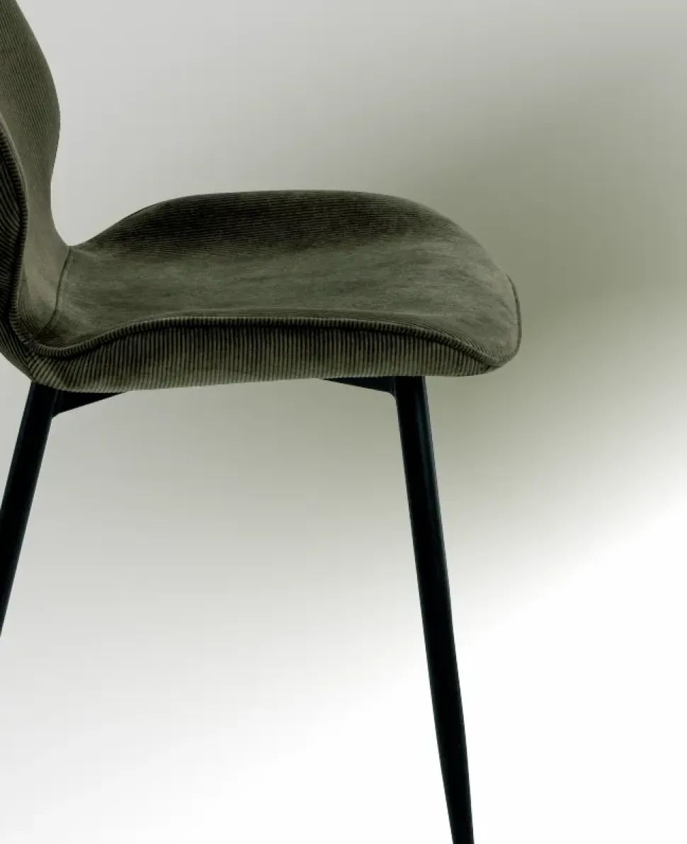 Il raffinato rivestimento in velluto e la longilinea base in metallo nero creano un’esperienza sensoriale a 360°.