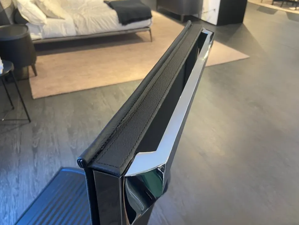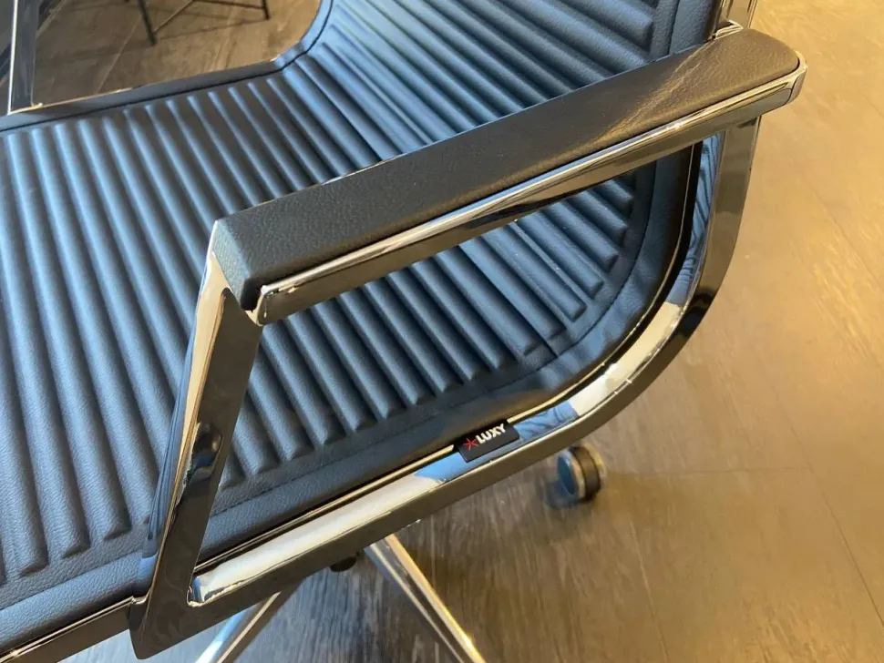 Sedia direzionale con schienale alto, braccioli in alluminio cromato e base in alluminio lucido.