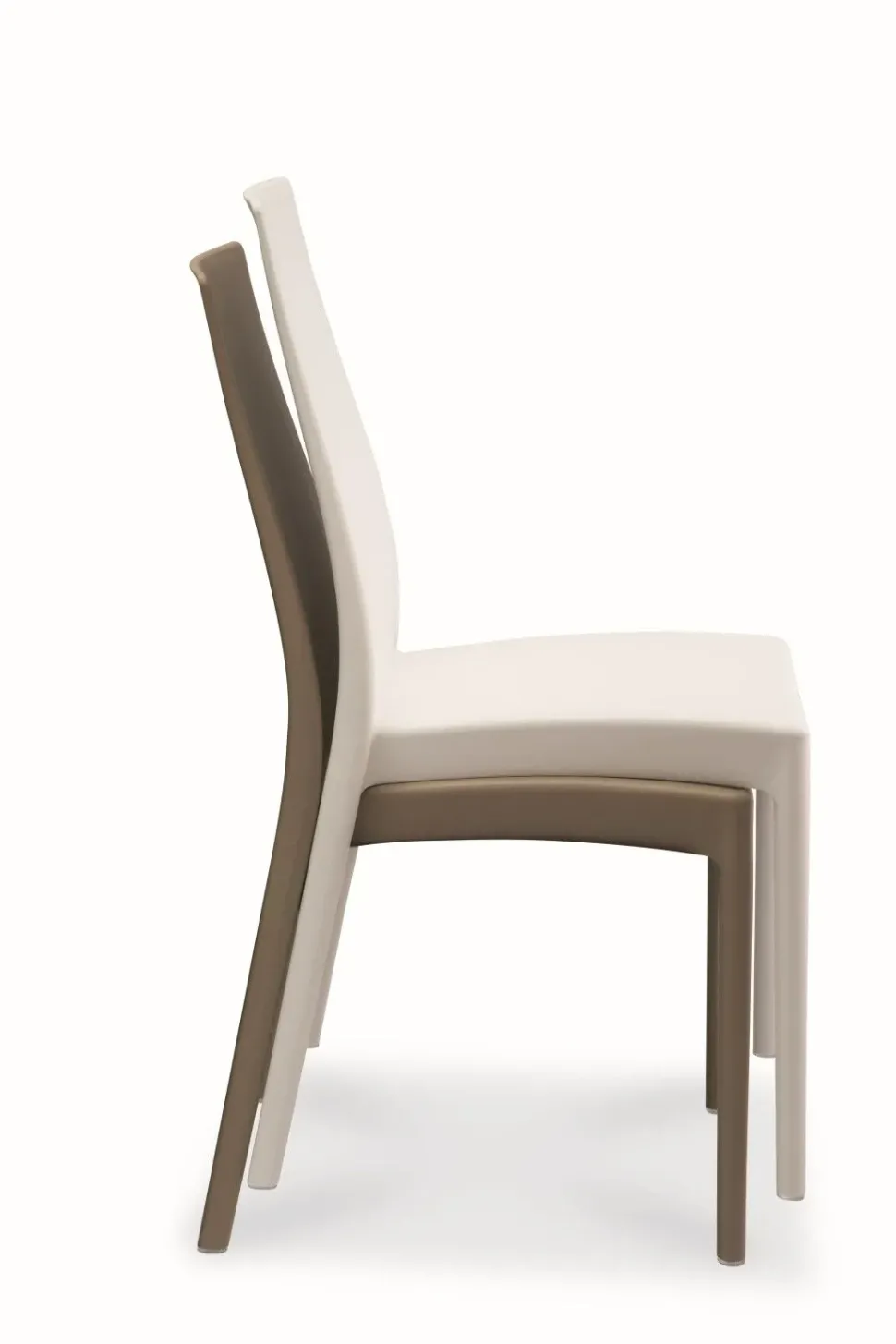 Il look è quello delle sedie più impegnate, ma il tono è alleggerito dal materiale, che preserva il design anche quando è impilata. Lo schienale alto e la seduta ben definiti restano chic in ogni ambientazione. Sedia Mira S106 con struttura integrale in polipropilene opaco in diverse varianti colore (adatta anche per uso esterno).