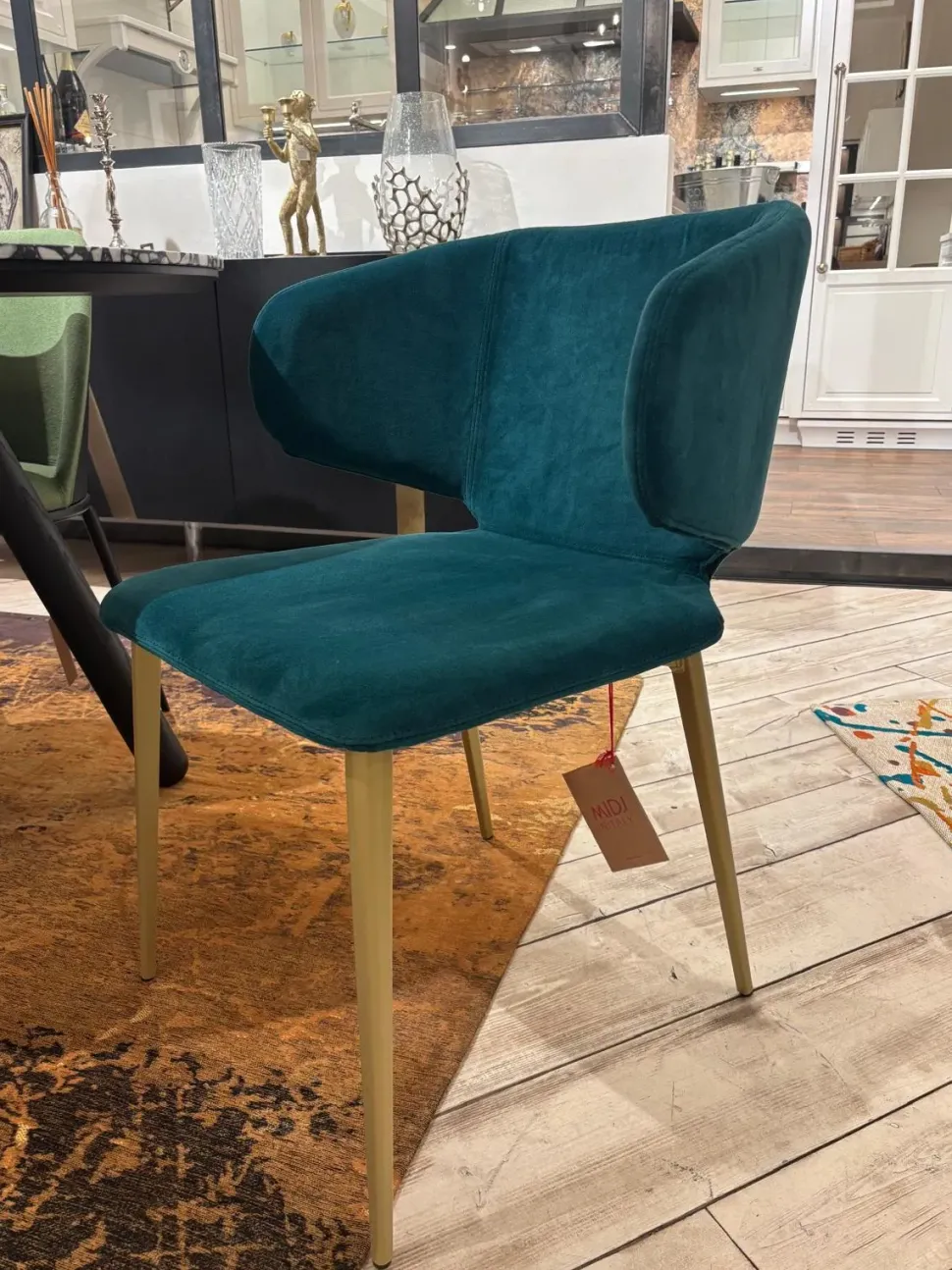 Gambe in acciaio verniciato oro e seduta in velluto superb pine green.