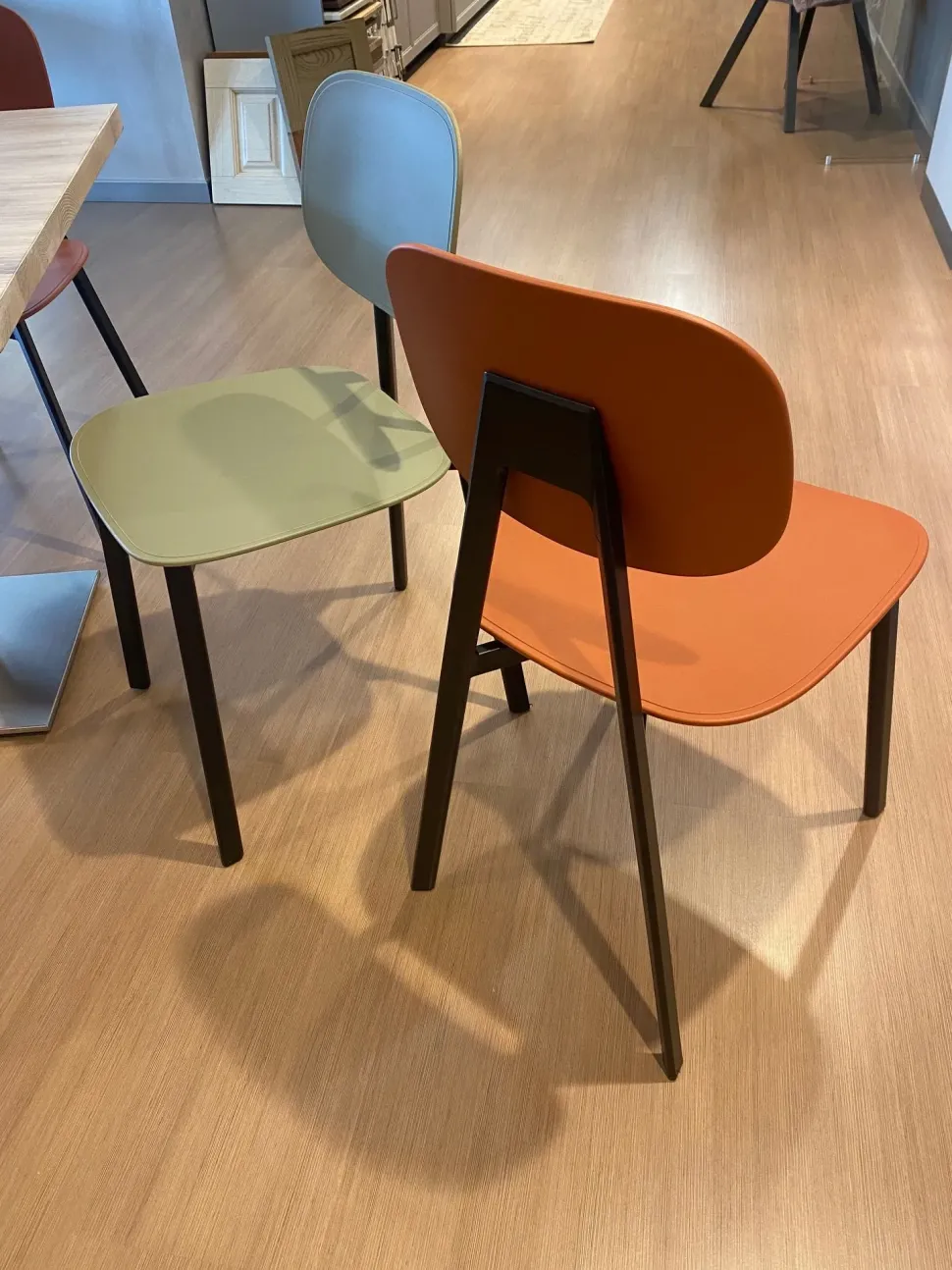 La struttura della sedia è in metallo nero opaco, colori a scelta. Super offerta per il set da 4 sedie modello tata in esposizione con: n. 2 sedie colore rosso mattone e 2 sedie colore salvia 440. Offerta valida solo per le sedie esposte.
