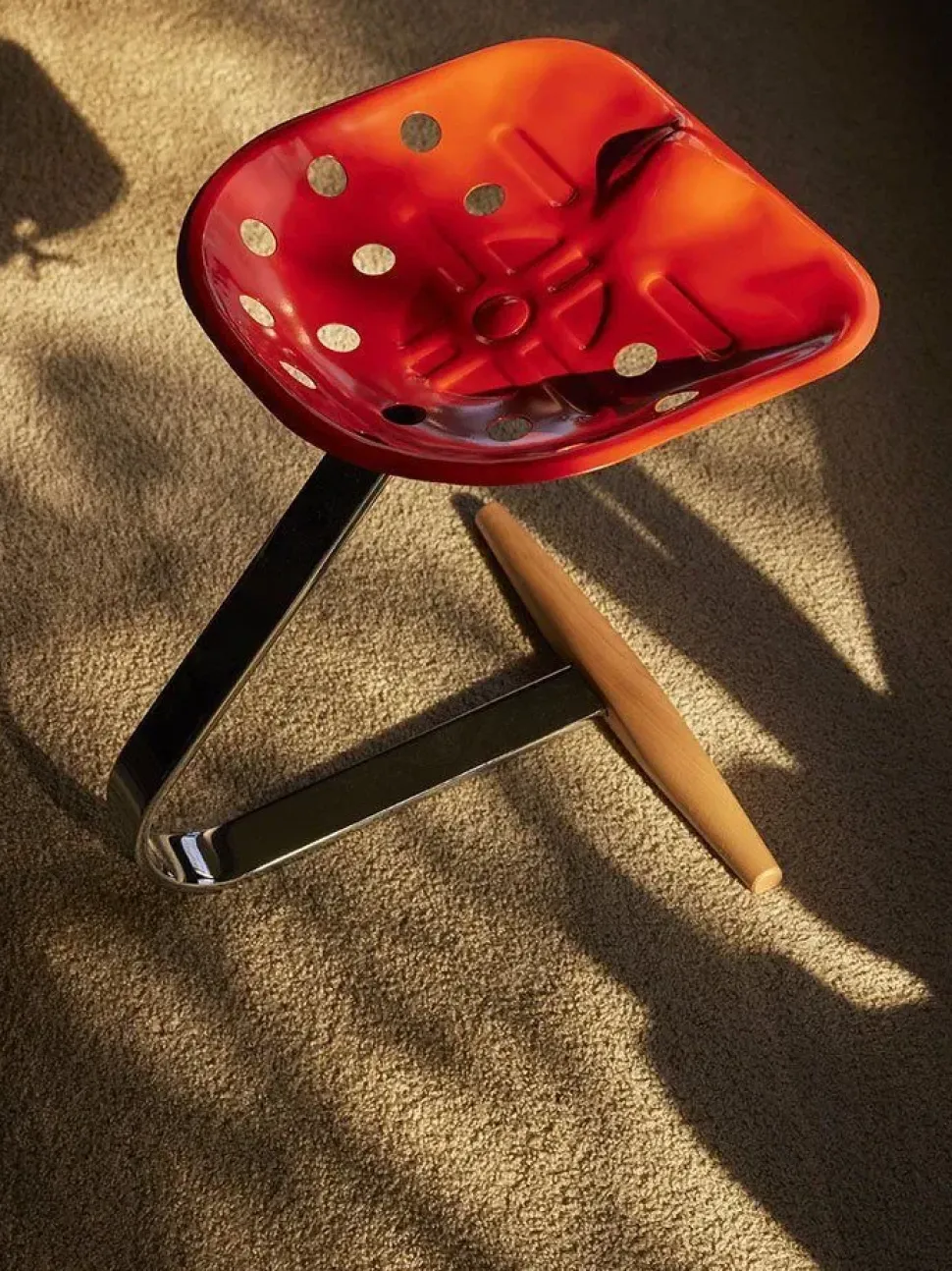 La sua seduta, dal colore rosso acceso, riprende infatti una classica sella di trattore, poggiata su un sostegno in acciaio cromato molleggiato che rende la seduta sorprendentemente confortevole. Lo sgabello Mezzadro si fa valere oggi come oggetto di design, come sgabello comodo e come complemento originale. Dim. 49 x 51 h.51 cm