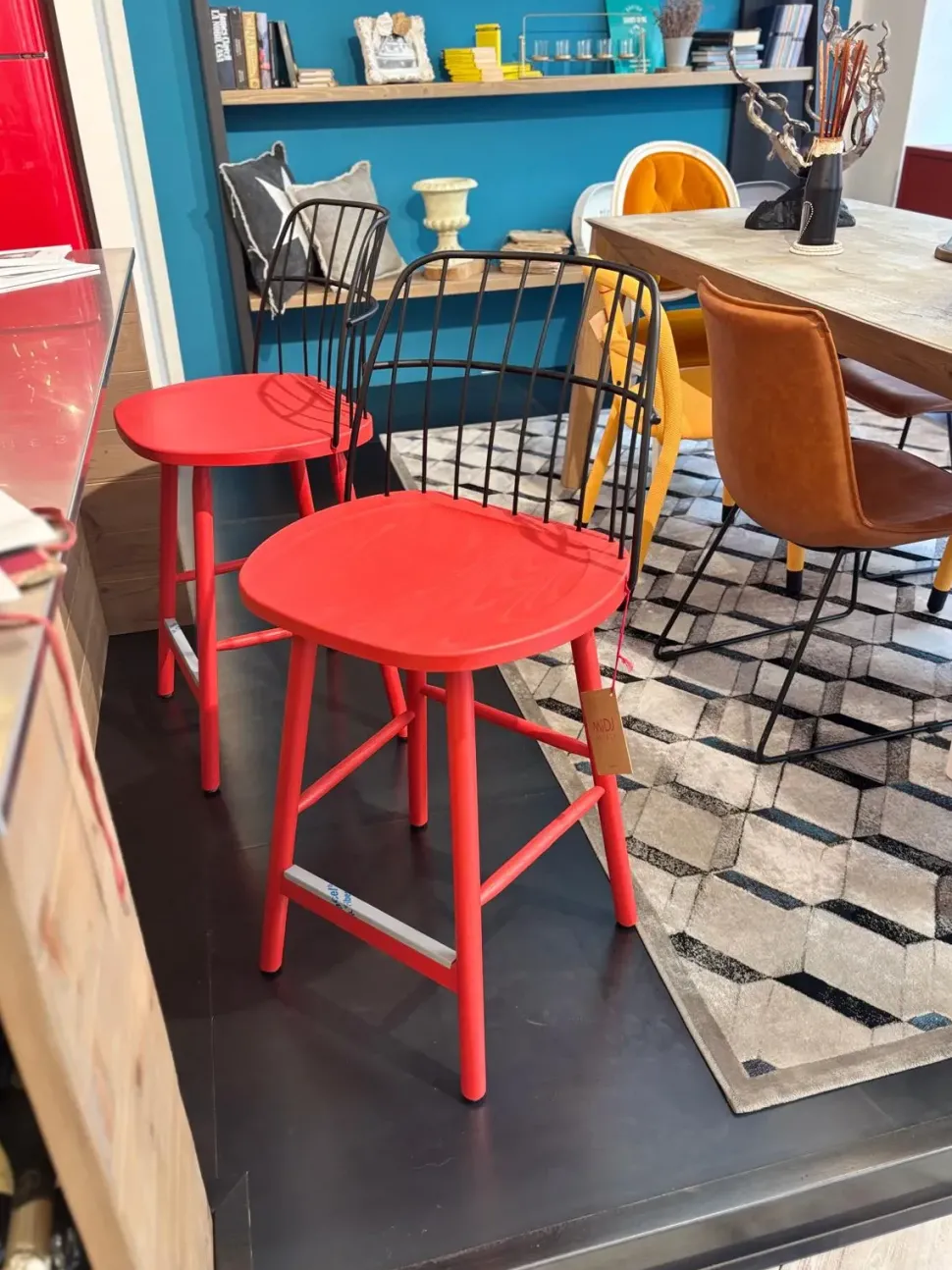 Sgabello STRIKE in frassino tinto ROSSO e schienale in metallo nero.