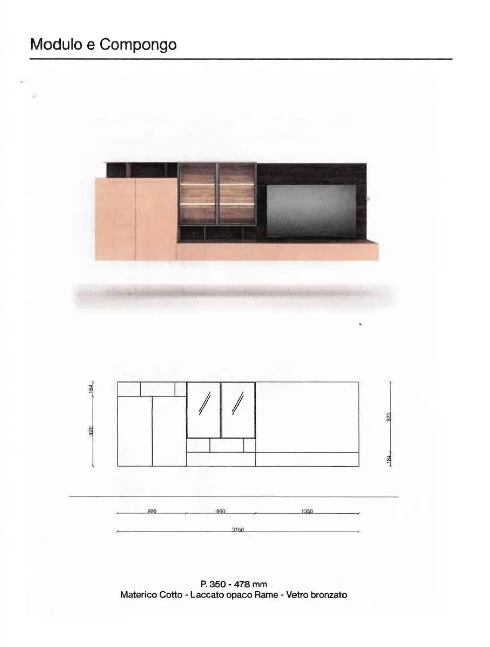 giorno da vivere con un innato senso dell’armonia. Riflessi preziosi amplificano lo spazio e creano affascinanti prospettive. Elementi Lanny in finitura laccato opaco Rame e cassettone Modulo. Pensili Modulo in materico Cotto con anta Glass in metallo brunito e vetro bronzato, ripiani retroilluminati. Dimensioni composizione: Larghezza 320cm, Altezza 110cm, Profondità 48cm. Spedizione compresa nel prezzo in tutta Italia 40-50 giorni lavorativi. La composizione ha un prezzo base di euro 2.300,00. Personalizzando con materiali legno e laccati come in foto l’offerta è di euro 2.800,00. Per maggiori informazioni e preventivi contattaci via mail.