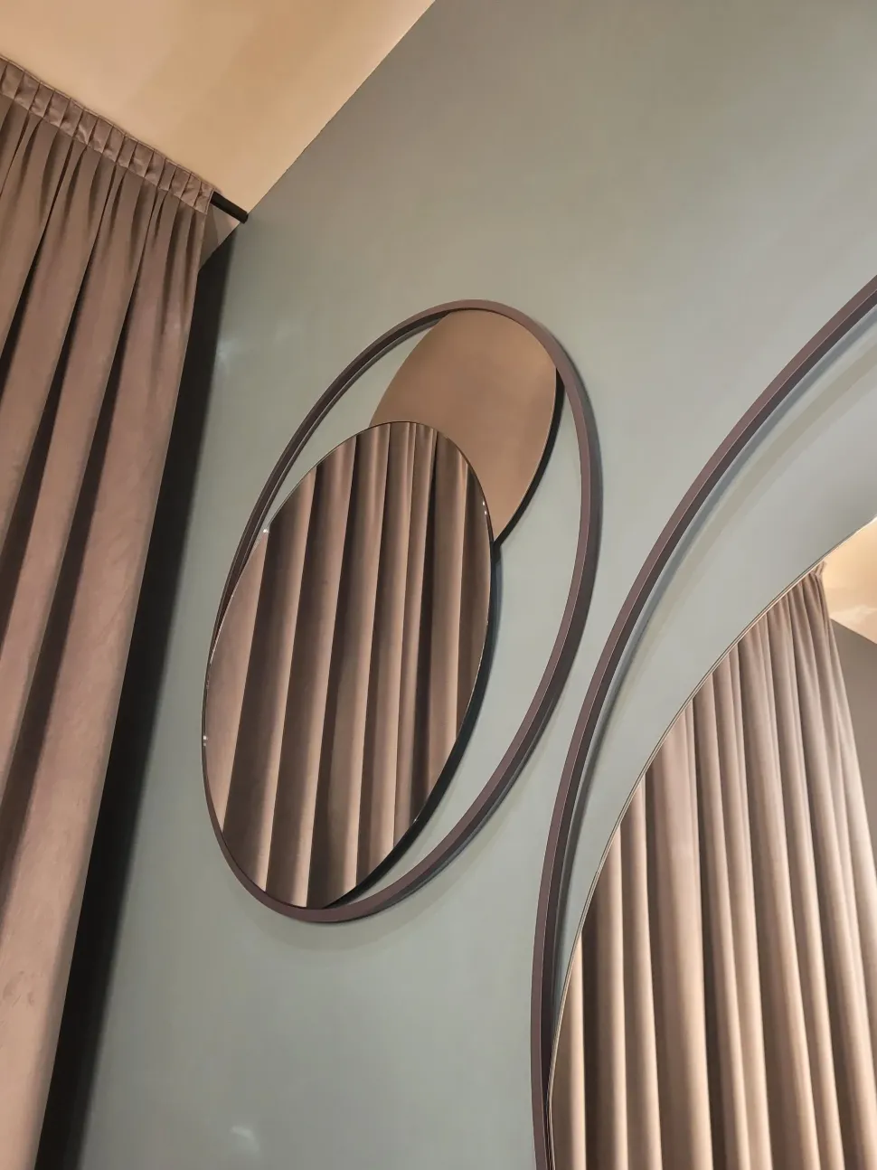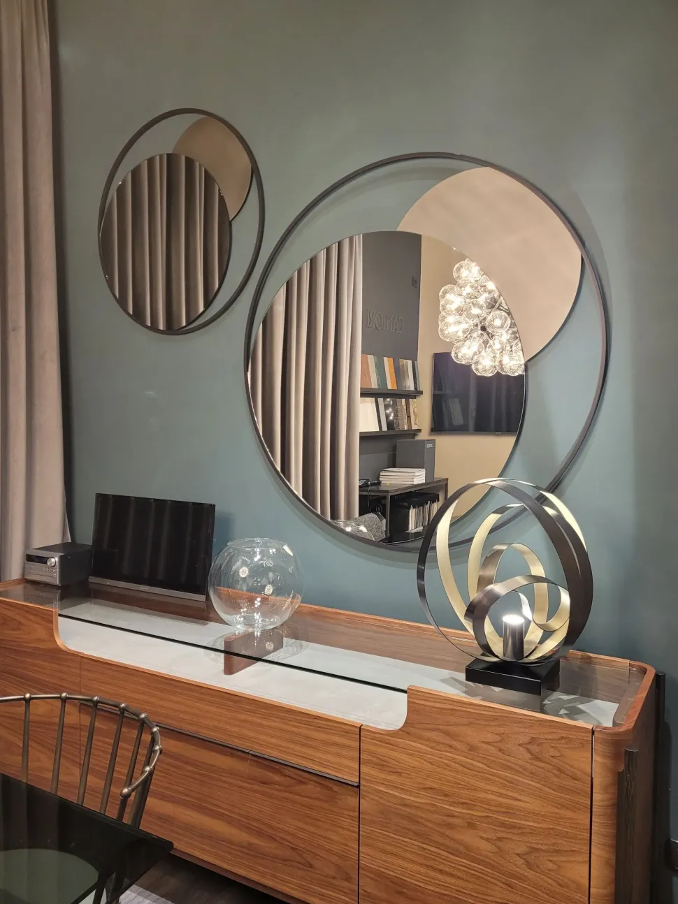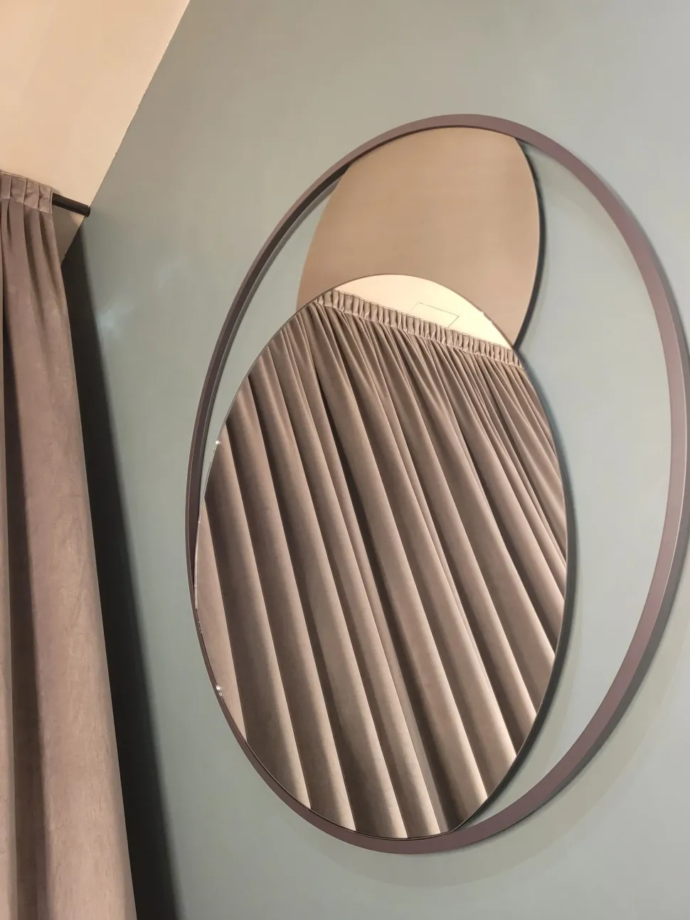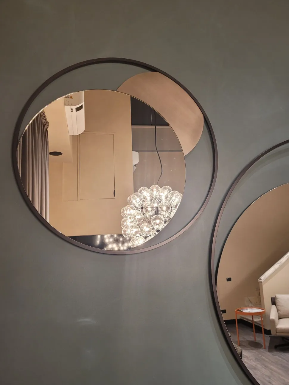 Circe, specchiera dallo stile originale ed essenziale, composta da una struttura esterna rotonda in acciaio pieno a seziona quadrata, all’interno del quale è inserito uno specchio circolare e una semiluna in acciaio personalizzabile con le finiture e decorazioni a campionario.