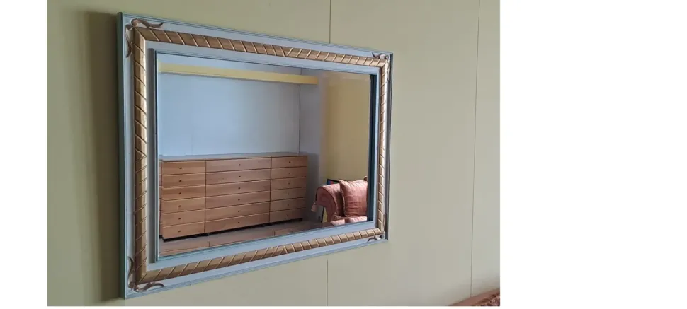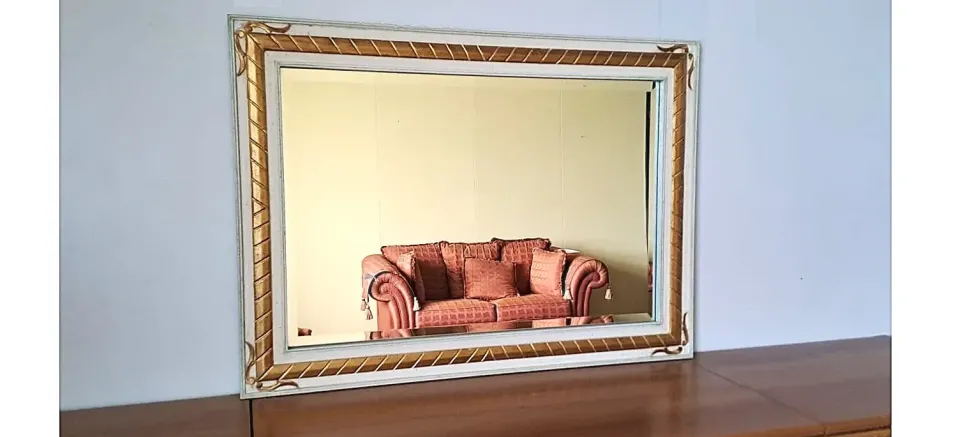 Specchiera con cornice patinata avorio e particolari oro, lavorazione specchio bisellato.