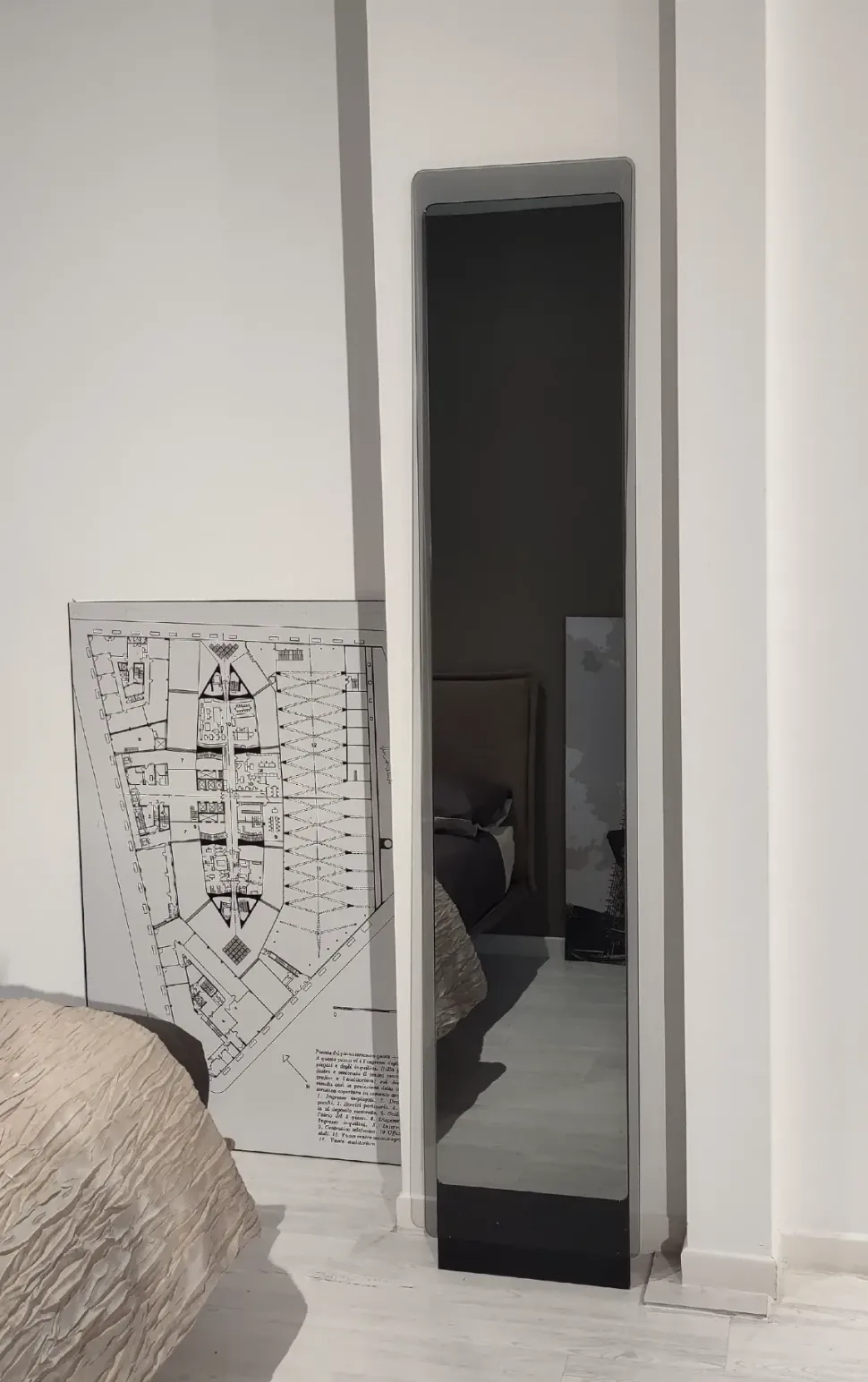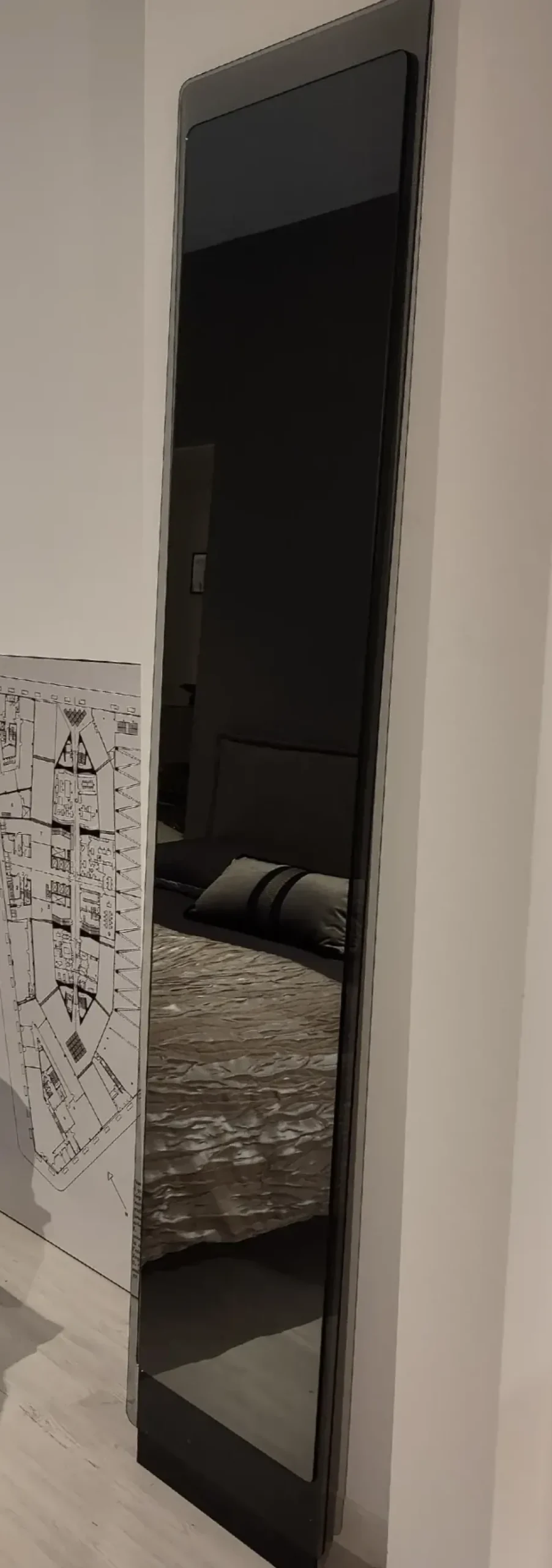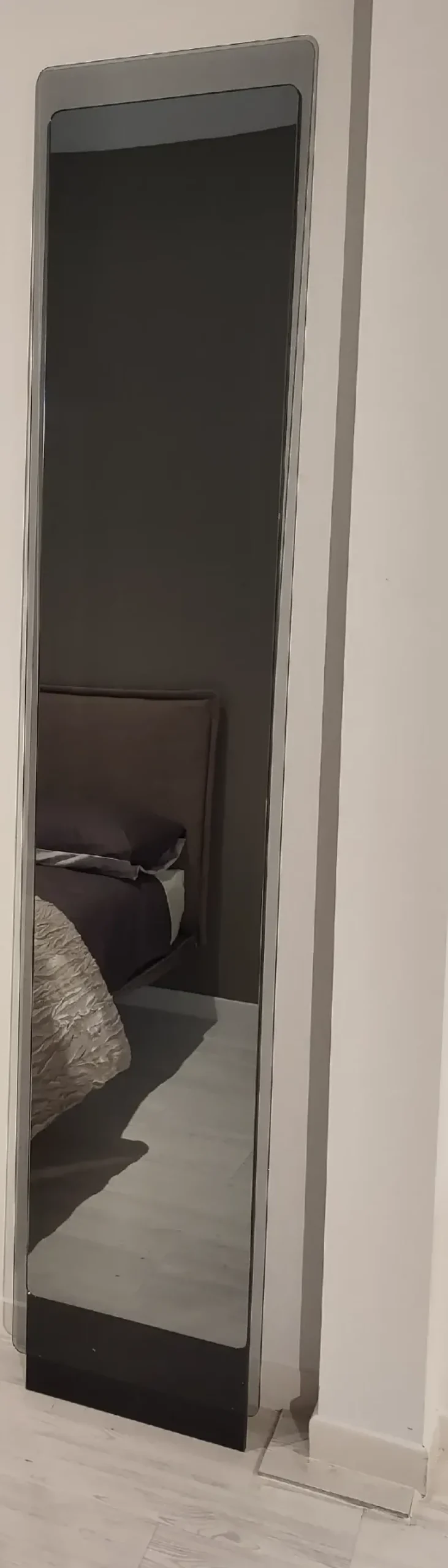 Specchiera da terra mod. Hide della ditta Pezzani con un vetro trasparente grigio fumè che fa da cornice allo specchio grigio fumè fissato su un pannello in laminato nero carbone che arriva a terra e incorpora il sistema di fissaggio a parete.