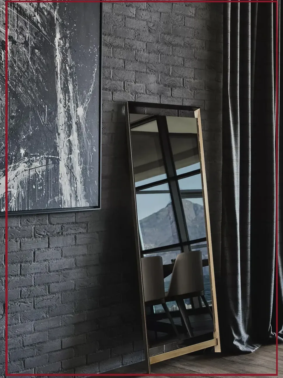 Pensato come specchio da terra con fissaggio a parete, si distingue per la sua struttura in acciaio laccato, che incornicia la superficie riflettente con sobrietà e solidità.