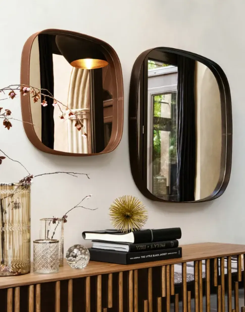 Specchiere sagomate bordate di vero cuoio in finitura testa di moro o cognac. Un design minimal e senza tempo.