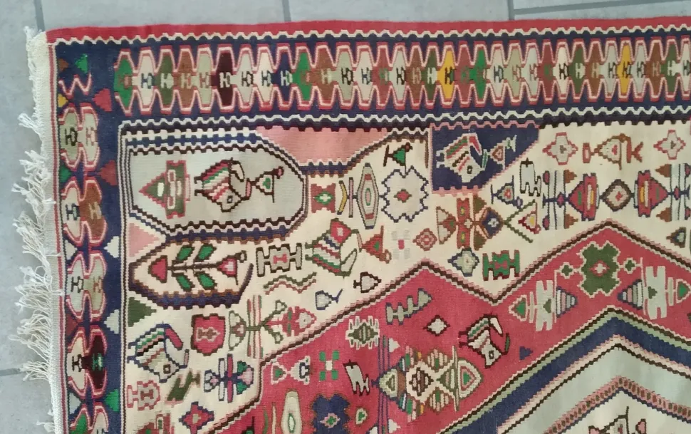 Tappeto decorato con disegni astratti con frange, in buone condizioni