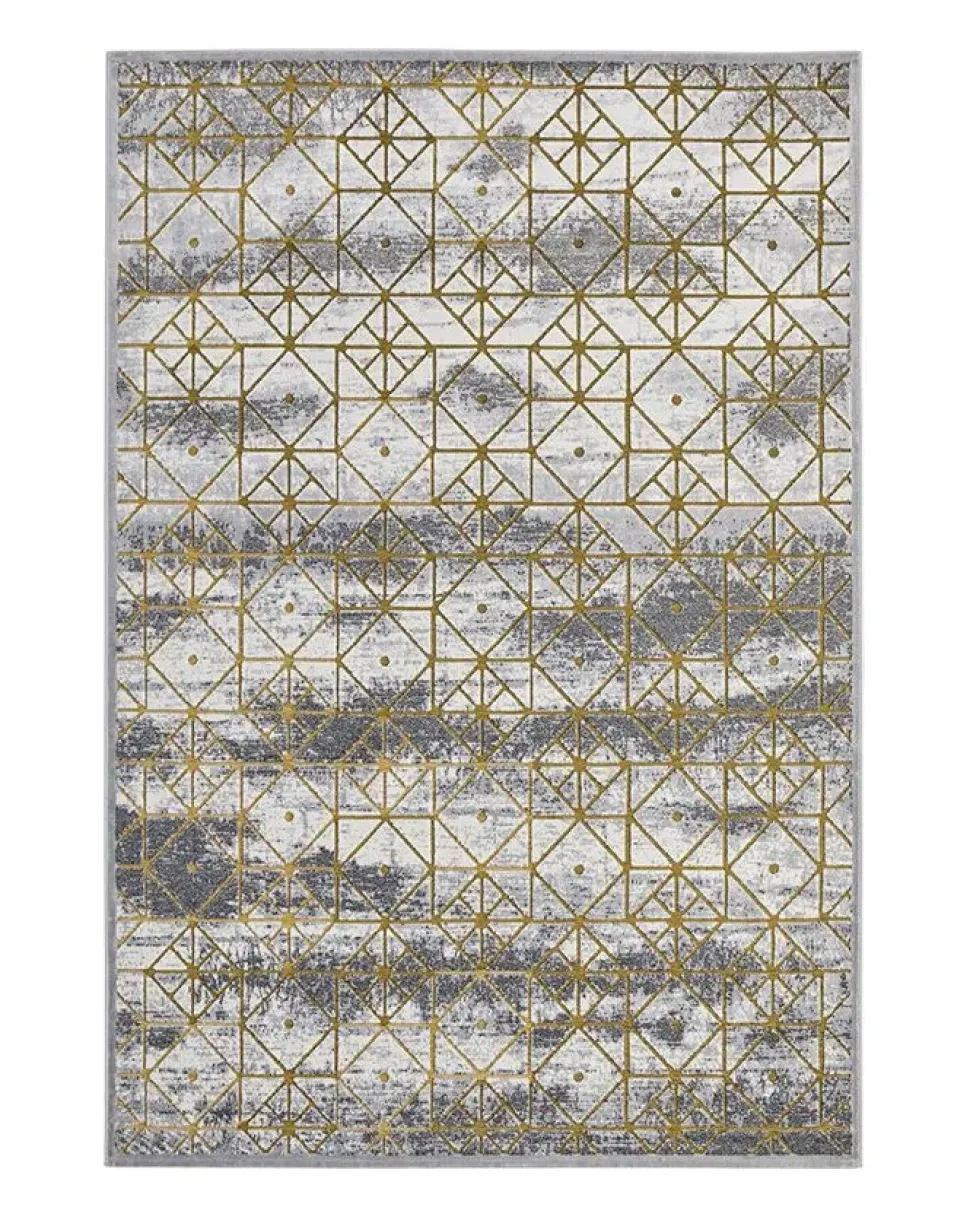 Simboli geometriche sono i protagonisti di questo tappeto riprodotti in tutte le gradazioni del colore grigio. La tridimensionalità di questo tappeto geometrico è esaltata ancor di più dal contrasto tra i disegni in ciniglia color oro, bassi e opachi, e lo sfondo del disegno in viscosa, che rimane più morbido, luminoso e cangiante. Perfetto in un ambiente moderno dai toni caldi. – viscosa 50% – polipropilene 50% – DIMENSIONI: cm 195 x 280 – Cod. 87114
