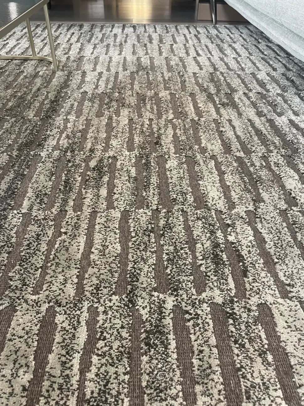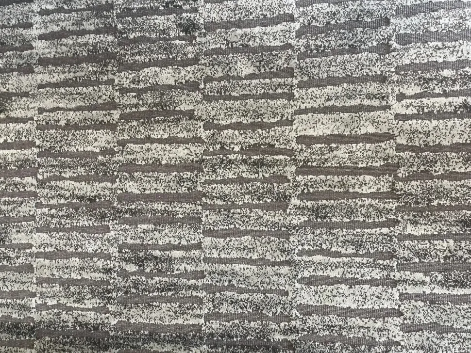 Tappeto tessuto in lana di base con disegno in rilievo in viscosa.