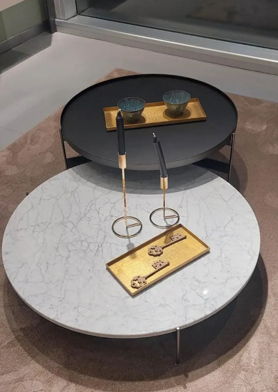 Tavolini Abaco struttura in titanio opaco e piano in titanio opaco e marmo lucido Carrara. (diametro 91 e 61 cm).