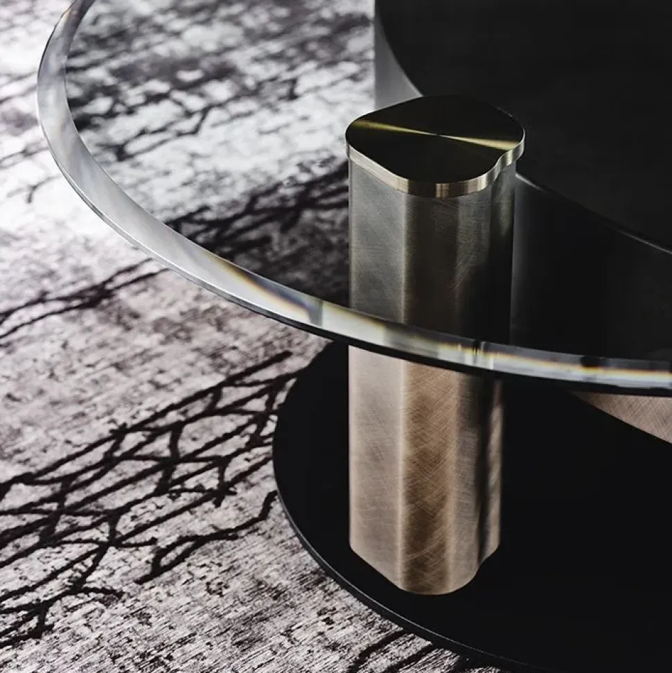Il prezzo si riferisce al tavolino Arena Bond completo di tavolino principale verniciato Brushed Bronze o Bushed Grey affiancato da un tavolino con base in acciaio verniciato goffrato Nero, colonna in acciaio verniciato Brushed Bronze e piano girevole in cristallo bisellato Fumè.