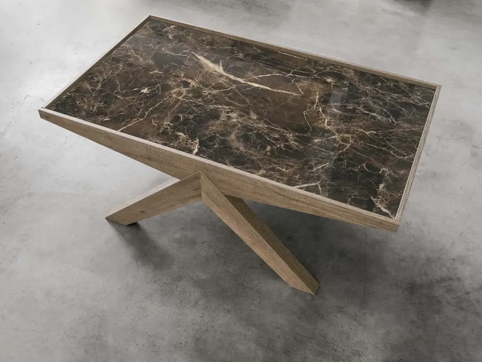 Tavolino da salotto in laminato con top in gres porcellanato.