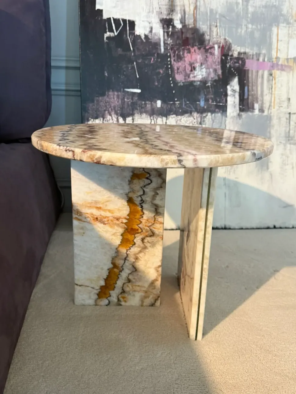 La struttura solida del tavolino Tebe è arricchita da gambe che conferiscono stabilità e una leggerezza visiva sorprendente. L’uso dell’onice non solo esalta l’estetica del pezzo, ma ne garantisce anche una durabilità senza pari. Questo materiale pregiato riflette la luce in modo affascinante, creando giochi di colore che catturano lo sguardo e aggiungono profondità all’ambiente circostante.