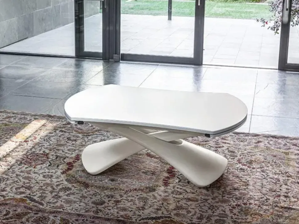 Tavolino trasformabile in tavolo da pranzo, meccanismo a gas, regolabile in altezza al millimetro da cm 41 a cm 80, piano rettangolare irregolare trasformabile in rotondo. Base rivestita in poliuretano rigido verniciato. Ruote a scomparsa.