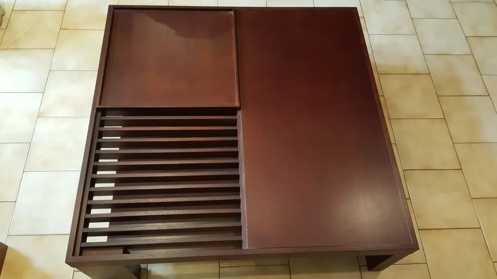 Il piano d’appoggio è diviso in due parti, una piana e liscia, l’altra costituita da listelli distanziati, che alleggeriscono visivamente la struttura e nello stesso tempo consentono di intravedere quello che c’è appoggiato sul piano sottostante.