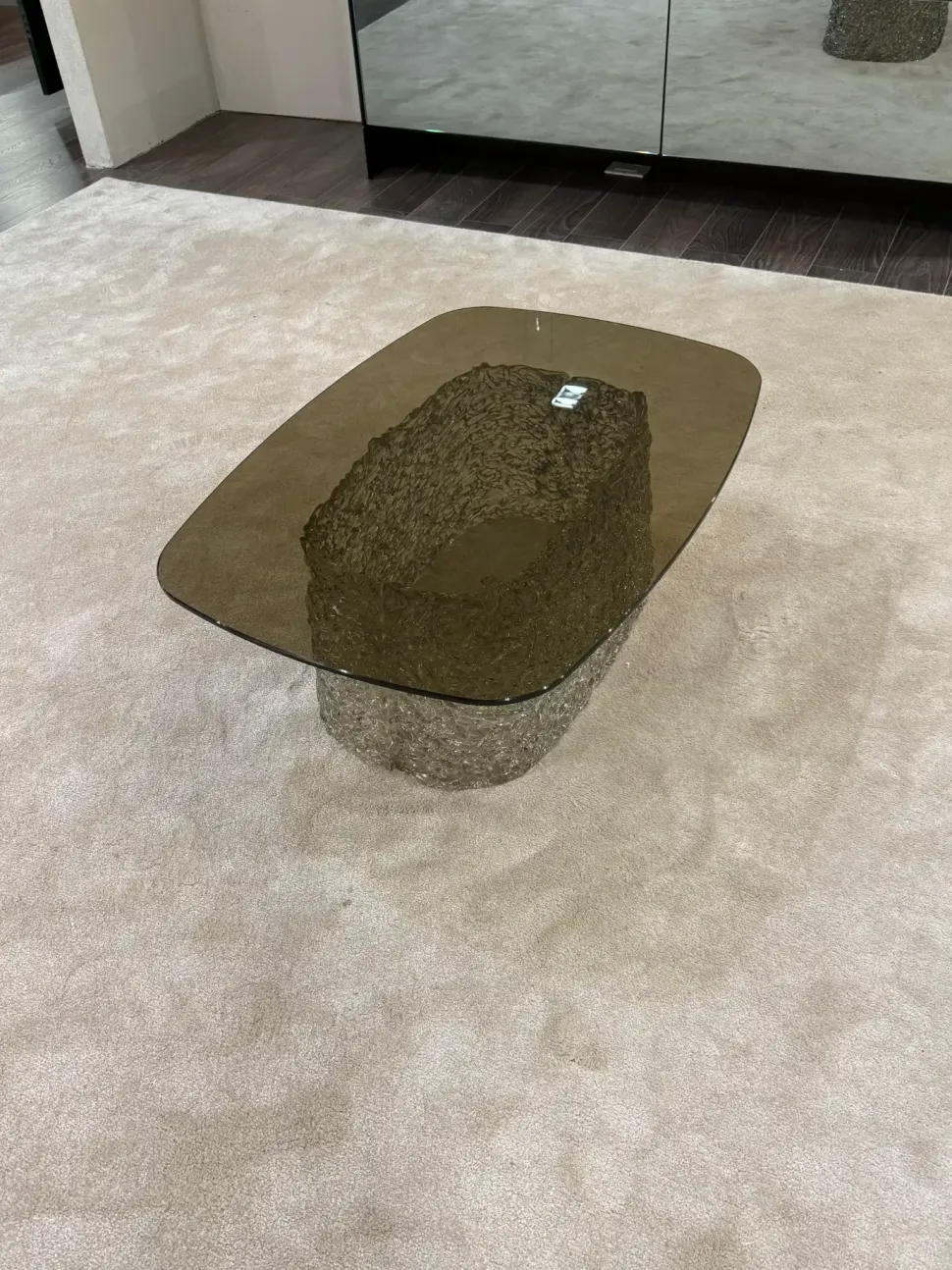 Il tavolino Macramè di Fiam: base in vetro filato intrecciato a mano, piano in vetro da 10 mm, design elegante e trasparente. In offerta outlet con sconto.