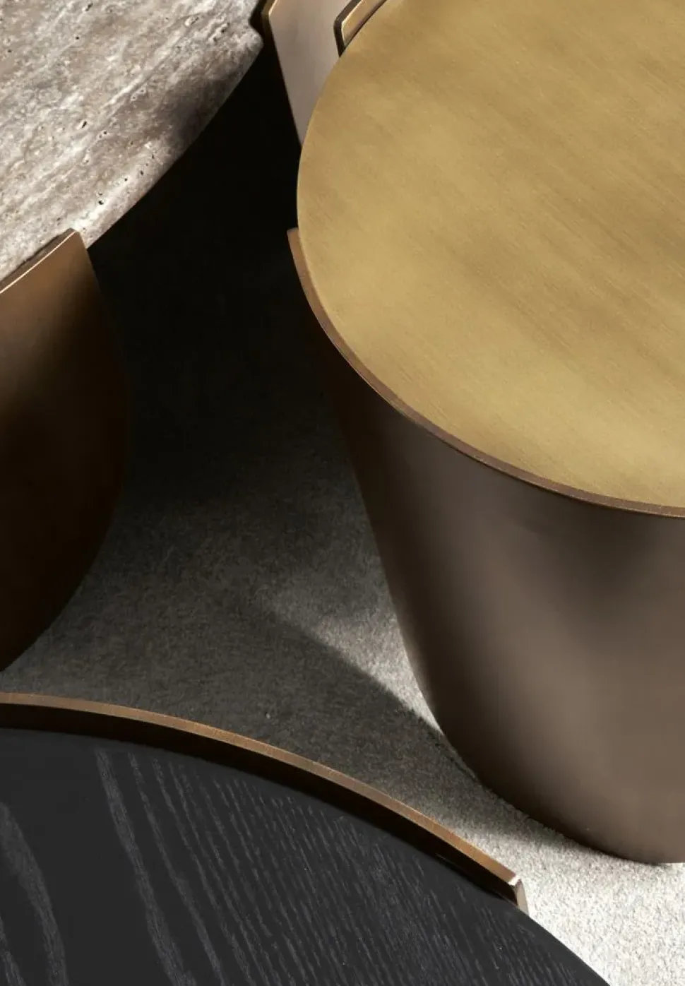 Le due spesse fasce di metallo curvato creano la struttura che avvolge e sostiene i piani in marmo, legno o metallo decorato. I diametri, le altezze diverse li rendono oggetti adatti, singolarmente o in composizione, all’inserimento in qualsiasi living. I tavolini Atenae permettono di creare composizioni sempre diverse e originali.