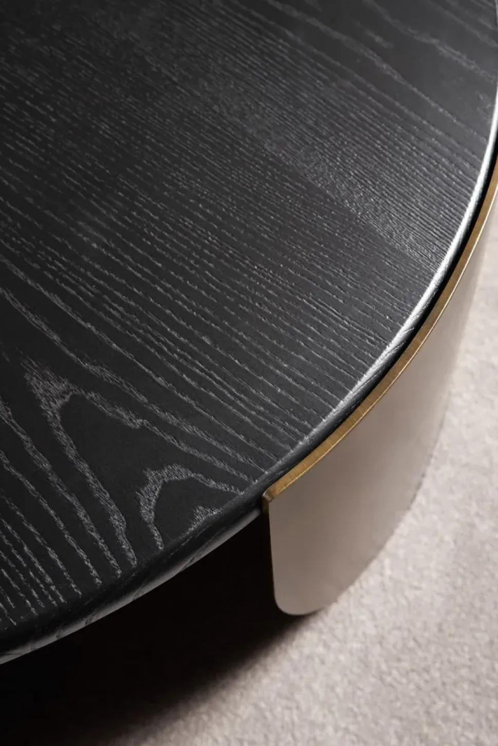 Atenae, tavolini da fumo rotondi dal design minimalista, con base in metallo curvato e piano proposto in metallo, legno e marmo.
