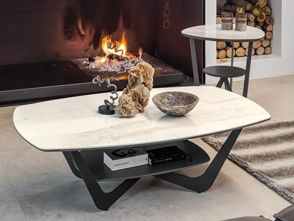 Tavolino con base in metallo verniciato a polvere, ripiano inferiore portaoggetti in tinta. Piano in ceramica spessore 3 mm su pannello.