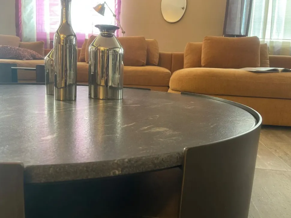 Disponibile nella versione con piano in marmo black cosmic e struttura finitura bronzo patinato come foto.