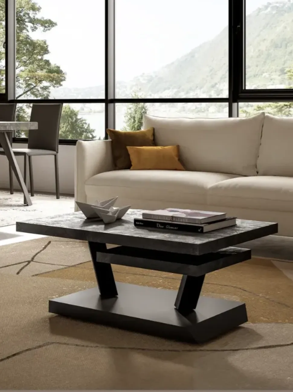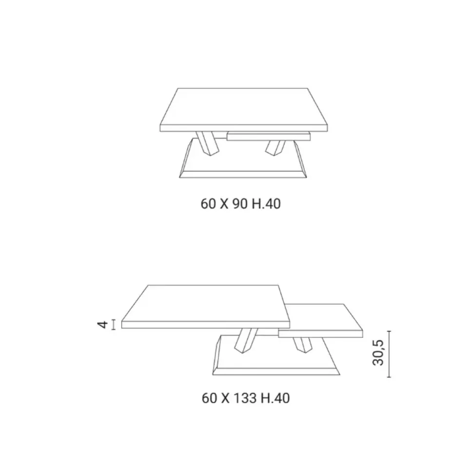 Tavolino con piani girevoli sincronizzati. Due piani realizzati a folding in eco legno.