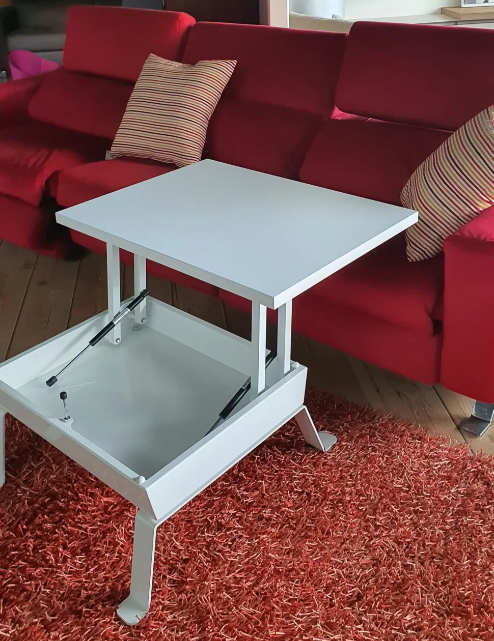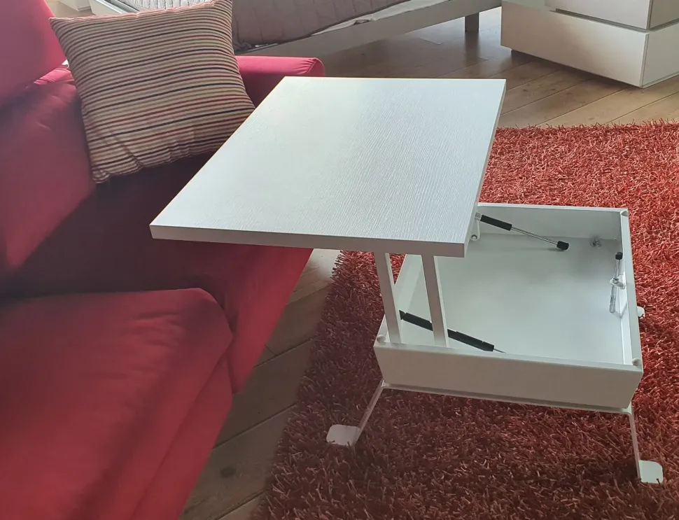 Seduti al divano, il piano di questo tavolino si utilizza per appoggiare il PC oppure per mangiare comodamente