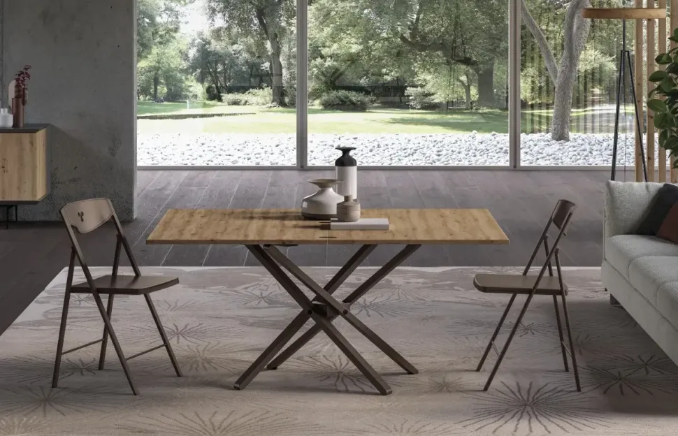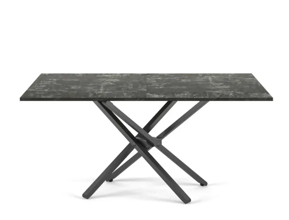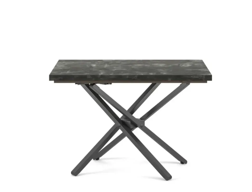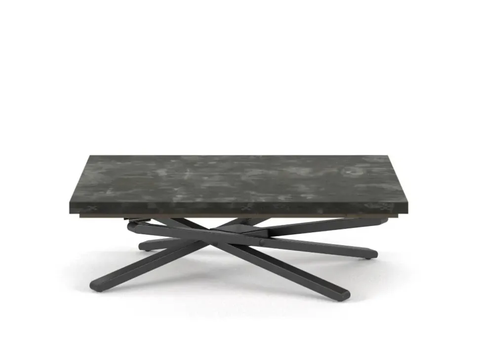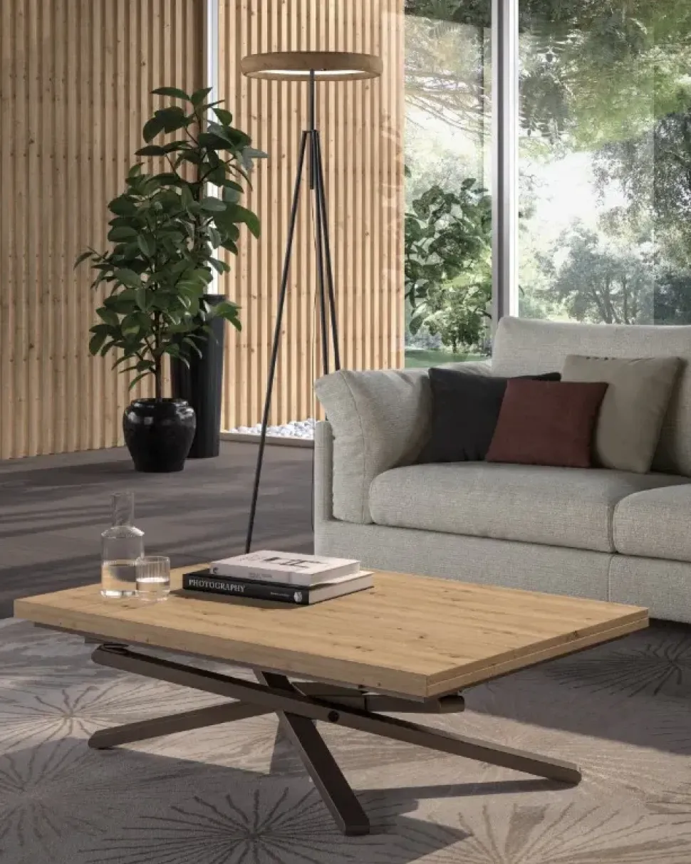 Linee decise e giochi di intrecci si fondono nella struttura scultorea di questo tavolino trasformabile. Un classico coffee table che con pochi e semplici movimenti, si trasforma in un accogliente tavolo da pranzo. Le finiture del piano in eco-legno e la robustezza del basamento metallico gli conferiscono carattere e funzionalita senza pari, il sistema di sollevamento e brevettato.