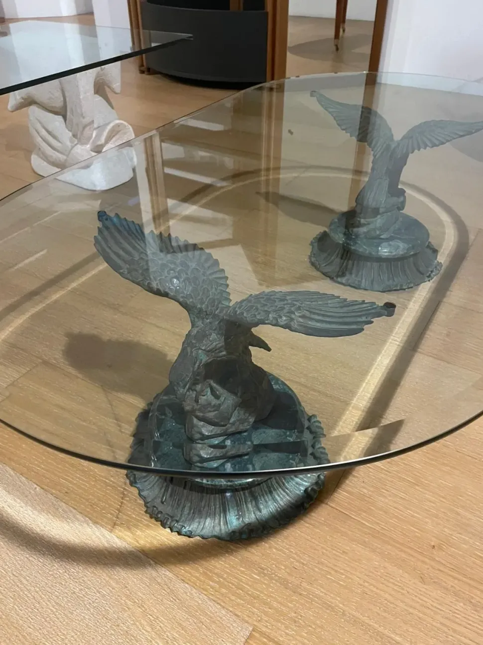 - Quali sono i punti di forza di questo tavolino?I principali punti di forza sono il basamento artistico con aquile in bronzo, il piano in cristallo e le dimensioni versatili. Un complemento d’arredo che unisce estetica e funzionalità.