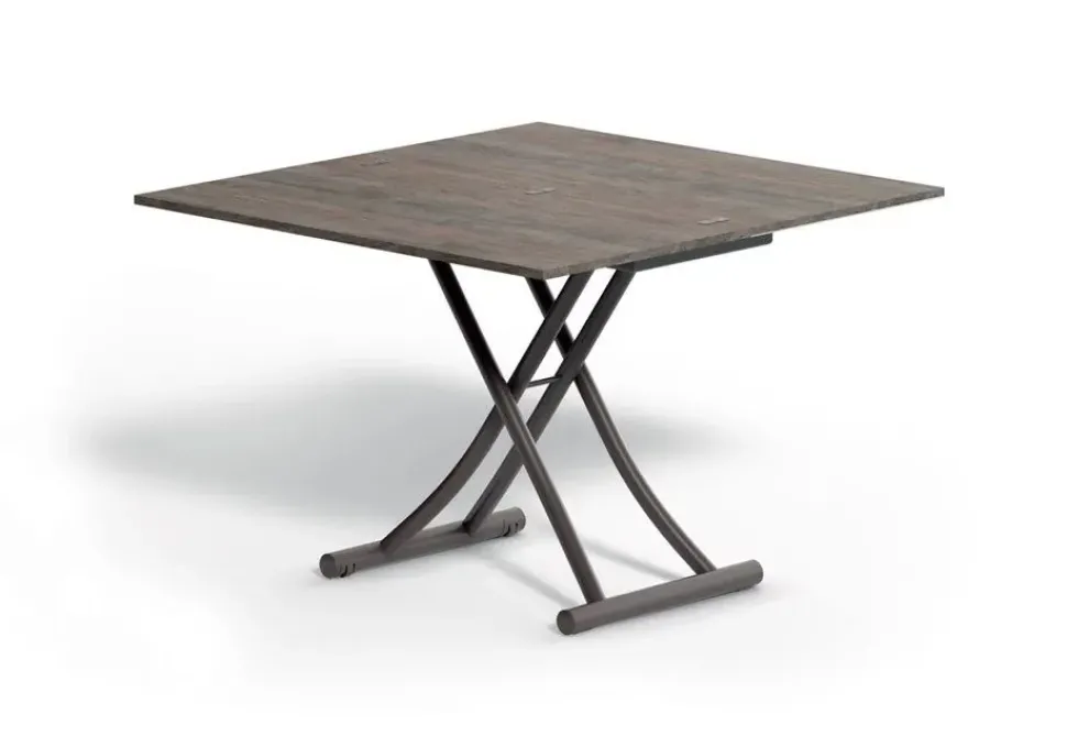Tavolino trasformabile con base in metallo e alzata con pistone a gas.