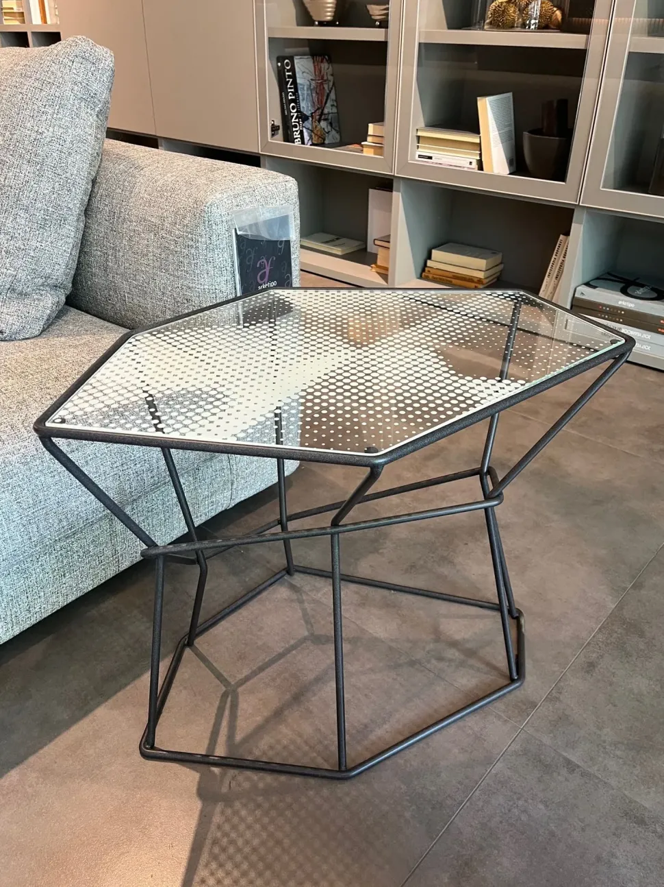 Tavolino Arketipo modello Rebus con struttura in metallo verniciato marrone micaceo e piano in vetro temprato serigrafato. Dimensioni L. 65.5 x P. 46 x H. 51 cm